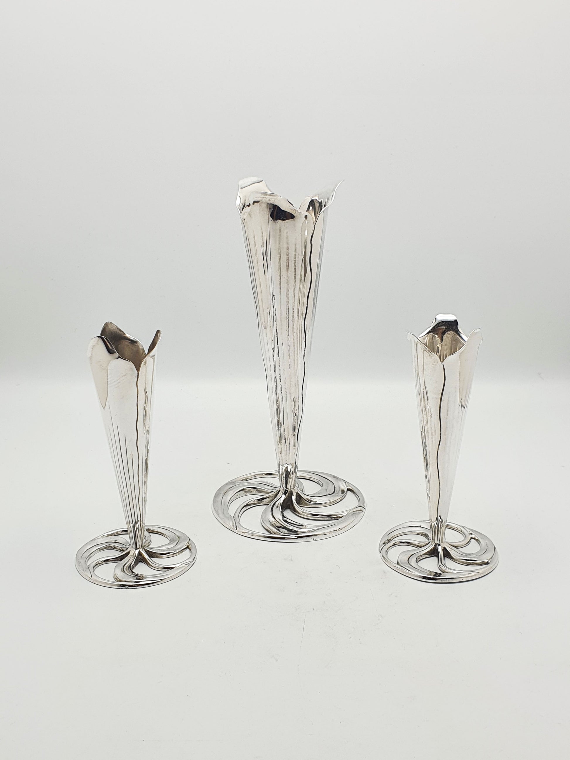Elegant Set of 3 Silver Plated Arts and Crafts Trumpet Vases – circa 1890