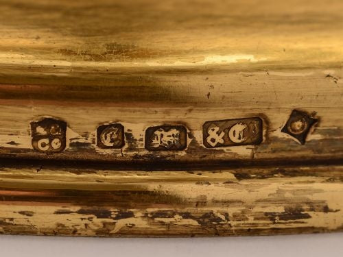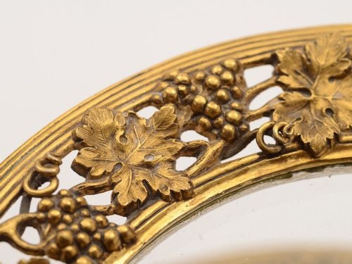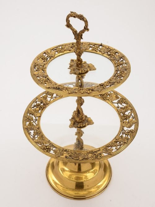 A fabulous Early Victorian English gilt bronze two tier cake stand with extensive vine and grape decoration to handle stem and edge of thick glass plates. Stands on plain base and is made by the renowned maker Elkington & Co with the date mark for 1853. Worldwide first class tracked and signed for delivery is included in the price. Measurements: Height: 15 (approx 37.5cm) Diameter across base: 6 1/4 (approx 15.5cm) Diameter across largest plate: 9 (approx 22.5cm) Diameter across smallest plate: 7 (approx 17.5cm) Total weight: 2040g In good condition - no chips or cracks to glass.