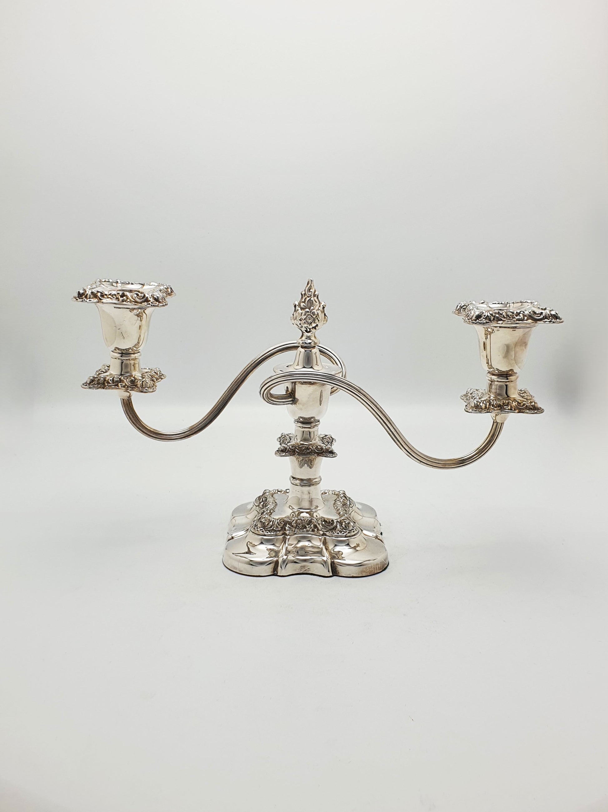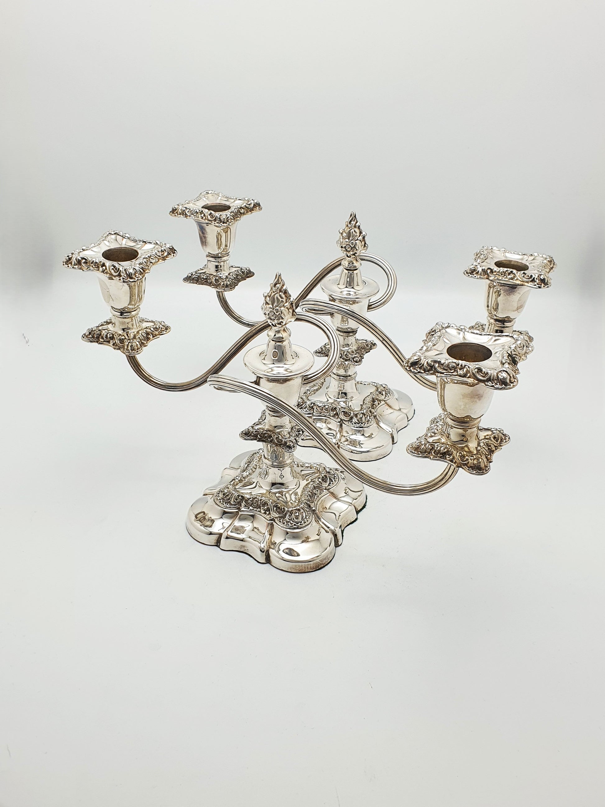An Excellent Pair of Antique Silver-Plated Low Candelabra crafted in the Rococo Revival style, they feature scrolling arms, ornate floral embellishments, and square sconces with intricate acanthus leaf borders. Each central column is crowned with a sculptural flame-shaped finial, adding drama and height. Their symmetrical design and graceful proportions reflect a time when elegance was the heart of entertaining – circa 1920.