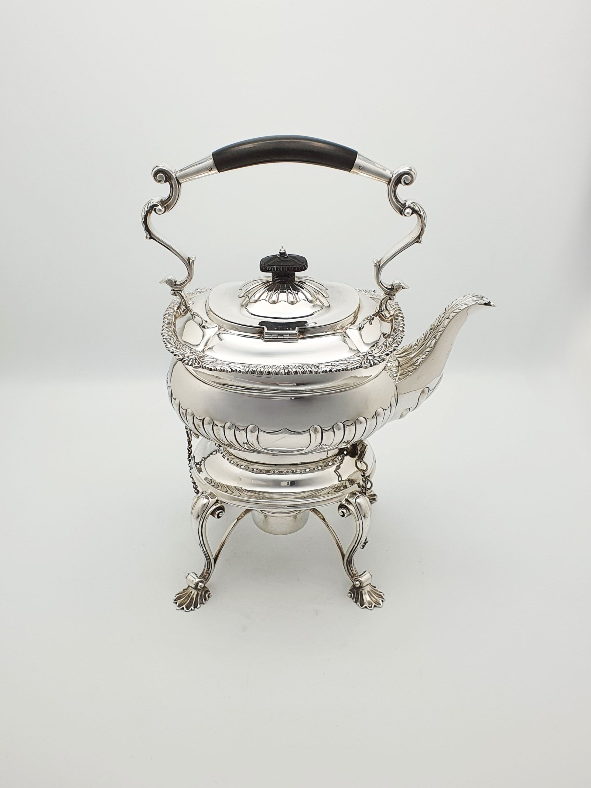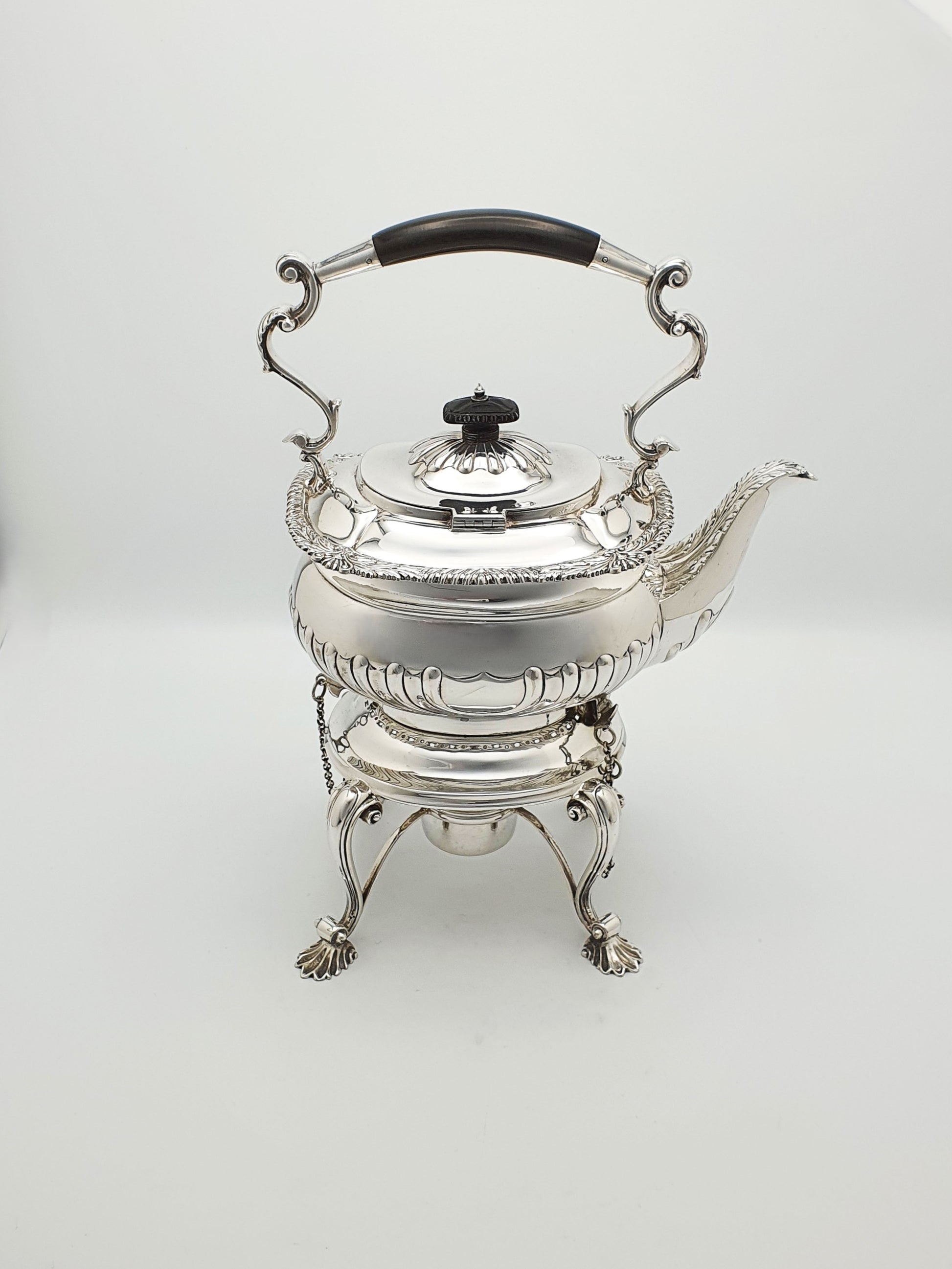 A Fabulous Antique Georgian-Style Silver-Plated Kettle on Stand featuring a classic fluted body, graceful scroll handle with ebony grip, and very finely chased detailing throughout. The kettle rests on an ornate stand with shell feet and comes complete with its original spirit burner.