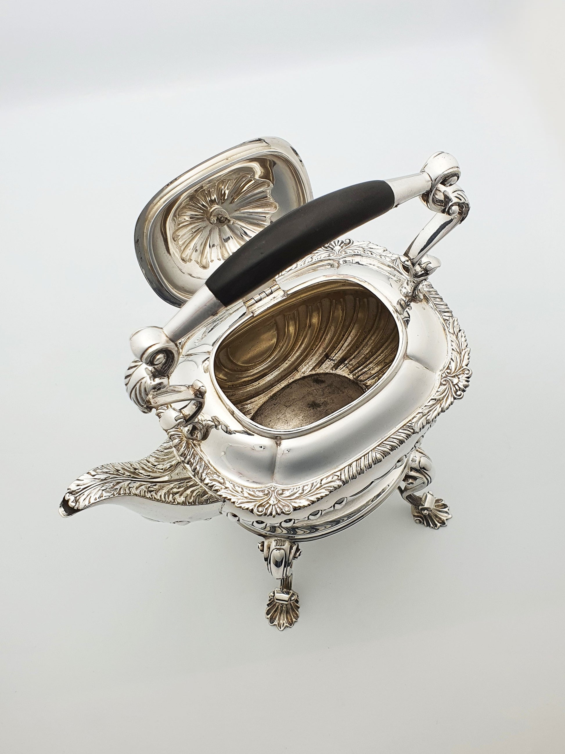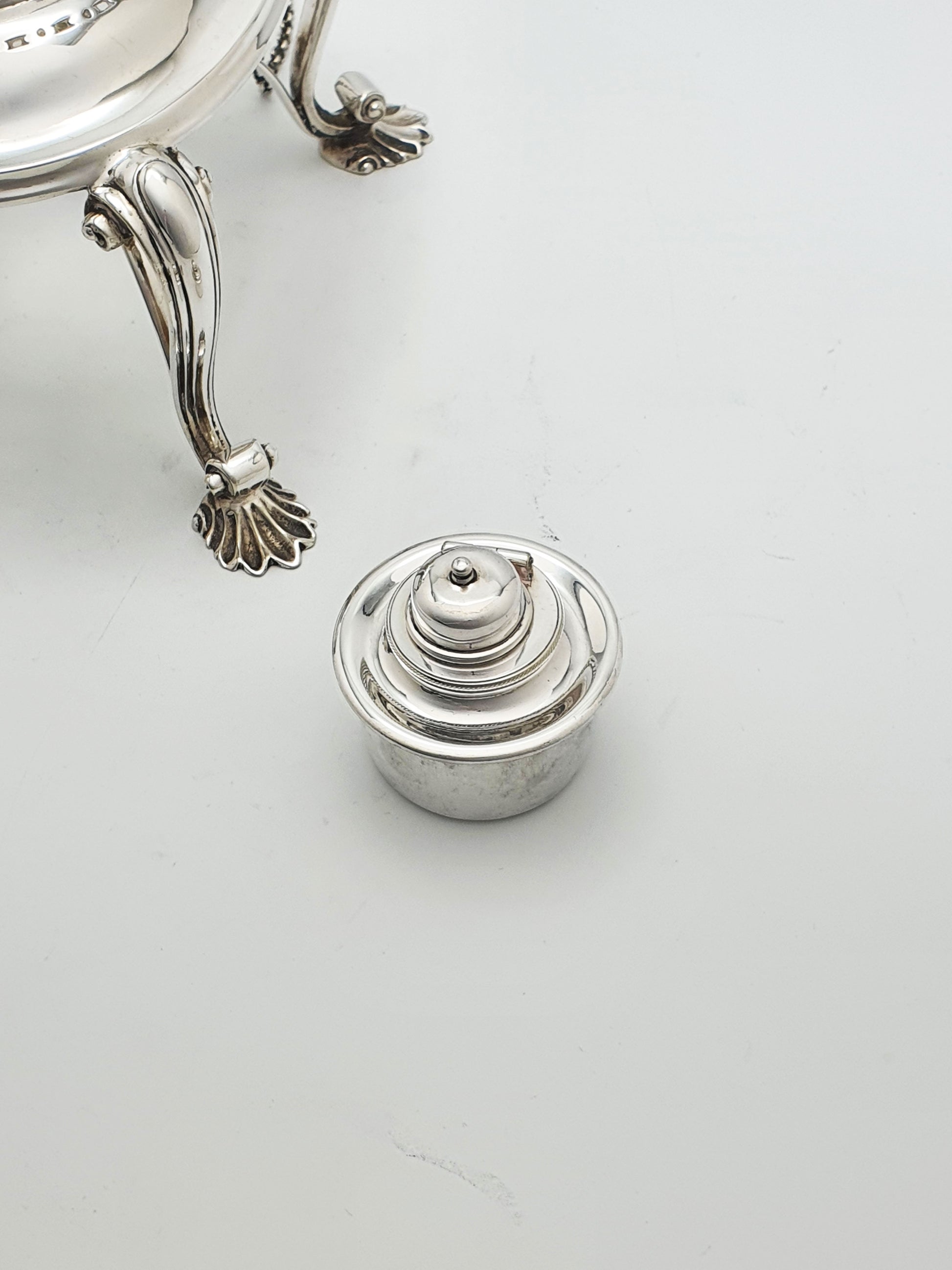In good condition – Silver surface retains a bright, mirror-like polish with gentle age-appropriate patina. Ebony handle and finial are smooth and free from cracks. Hinges, lid, and burner cap function perfectly. No dents, splits, or repairs — a beautifully preserved example.