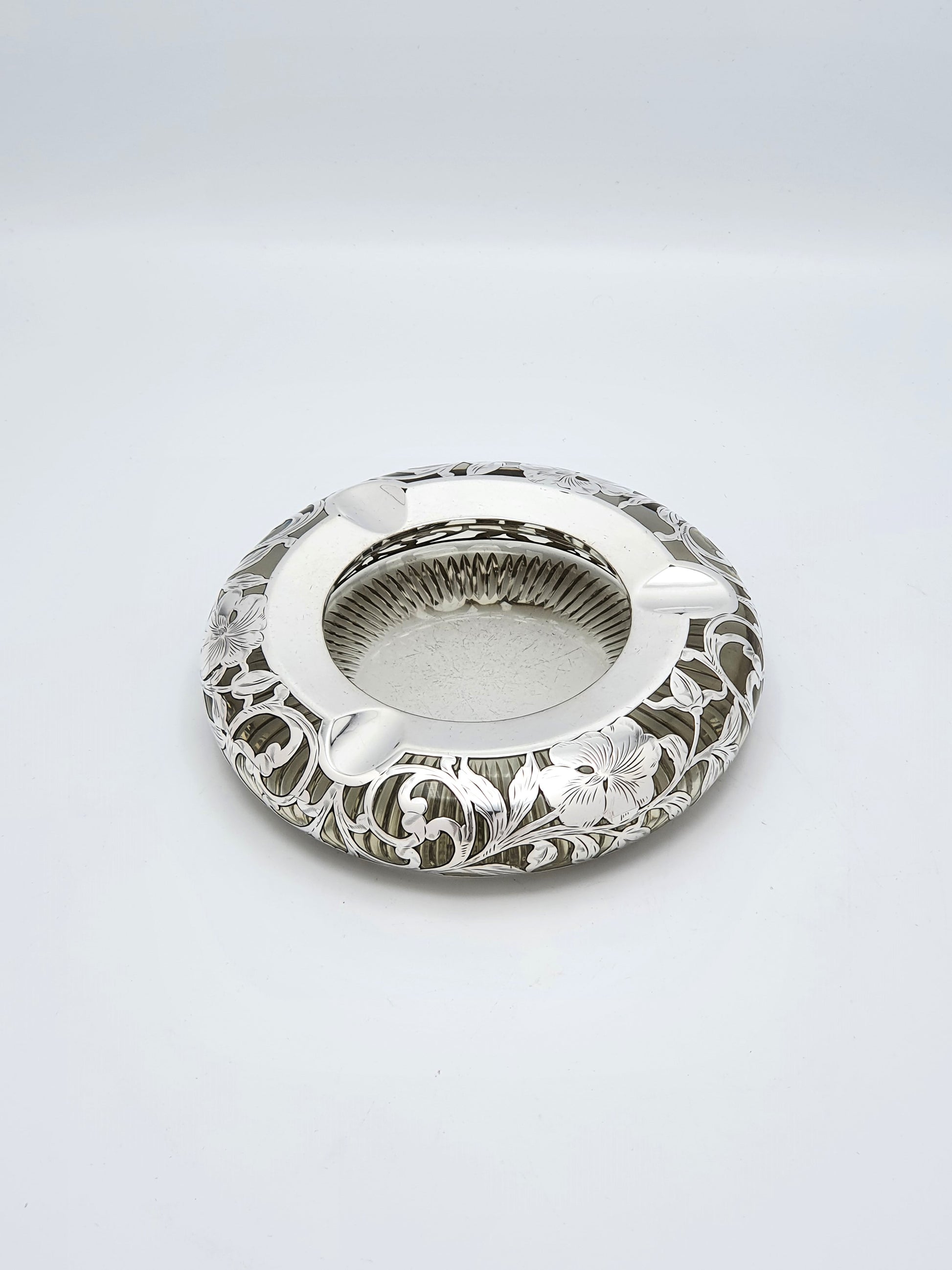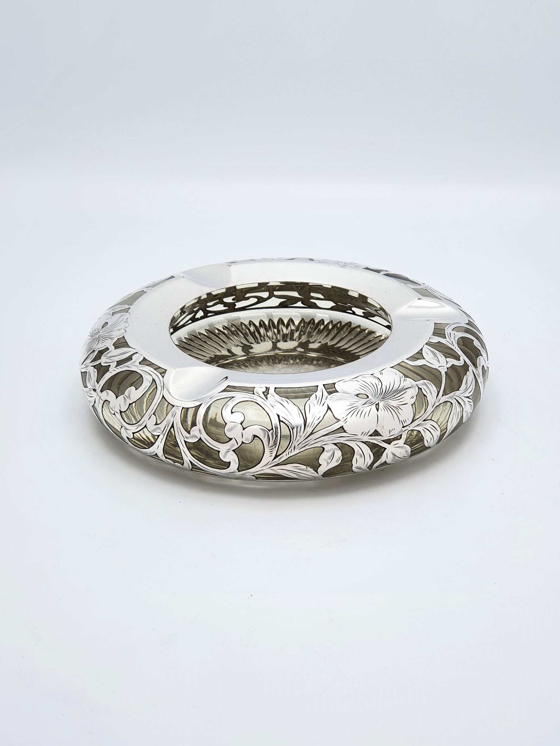 A Really Fabulous Antique Cut Glass Ash Tray with Sterling Silver floral overlay on a heavy cut glass base - circa 1900.