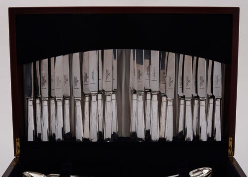 A fabulous English Art Deco boxed 94 piece silver plated canteen with traditional Art Deco decoration. This canteen is an 8 place setting comprising of: 8 large knives 8 medium knives 8 tea spoons 8 coffee spoons 8 dinner forks 8 dessert forks 8 dessert spoons 8 soup spoons 8 fish knives 8 fish forks 4 serving spoons and 2 sauce ladles. Presented in modern velvet and silk lined box. Circa 1930. FREE worldwide delivery. Measurements: Box height: 5 (approx 12.5cm) Box length: 18 (approx 45cm) Box width: 12 (approx 30cm) Dinner knife length: 9 3/4 (approx 24.5cm) Dessert knife length: 8 1/4 (approx 21cm) Dessert fork length: 7 (approx 17.5cm) Dinner fork length: 7 1/2 (approx 19cm) Soup spoon length: 7 1/4 (approx 18cm) Soup ladle length: 6 1/4 (approx 15.5cm) Dessert spoon length: 7 1/4 (approx 18cm) Serving spoon length: 7 3/4 (approx 19cm) Tea spoon length: 5 3/4 (approx 14.5cm) Coffee spoon length: 5 (approx 12.5cm) Fish knife length: 8 (approx 20cm) Fish fork length: 7 1/4 (approx 18cm) Total weight: 8050g In good condition - any dark areas are shadows from the photography there is no damage to the silver plate.