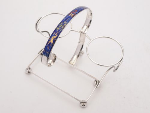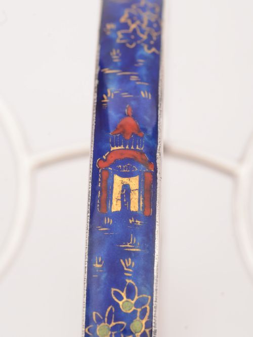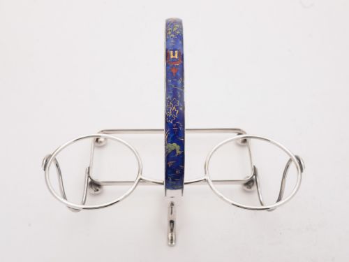 A fabulous English Art Deco china sandwich set in original silver plated frame which has matching blue enamel decoration. The china set is made by the renowned maker George Jones and the stand is made by Mappin & Webb. Has Chinese style decoration in gilt red and gold on a blue background. Possibly made to be exhibited at an exhibition as I believe this to be a one off. Circa 1930. FREE worldwide delivery. Measurements: Height: 8” (approx. 20cm) Length: 11” (approx. 27.5cm) Width: 8” (approx. 20cm) Total weight: 1594g In good condition - no chips or cracks to china or enamel.