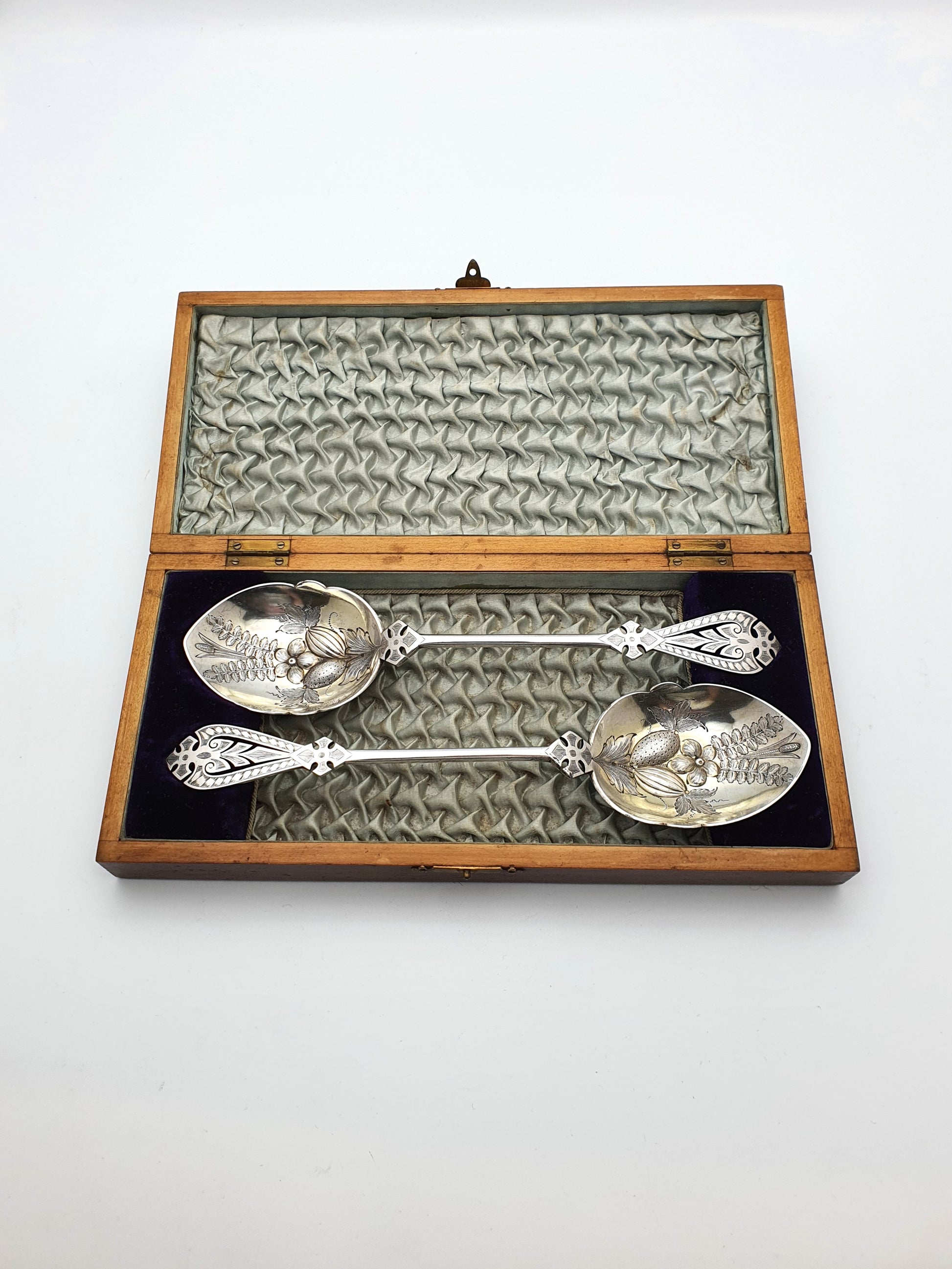 Fabulous Cased Victorian Silver-Plated Serving Spoons with embossed, pierced and engraved decoration. This pair comes in a burr walnut velvet and silk lined case – circa 1890.
