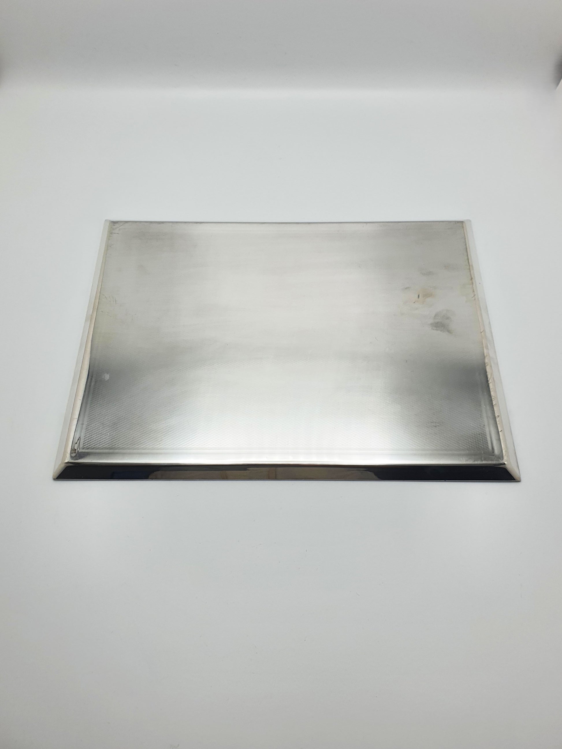 A Fabulous Christofle Silver-Plated Rectangular Cocktail Tray featuring a refined engine-turned pattern with a sleek polished border, this piece reflects the impeccable quality and craftsmanship of one of the most prestigious silversmiths in the world. Stamped with the renowned Christofle hallmark, synonymous with French silver-plated excellence – circa 1960.