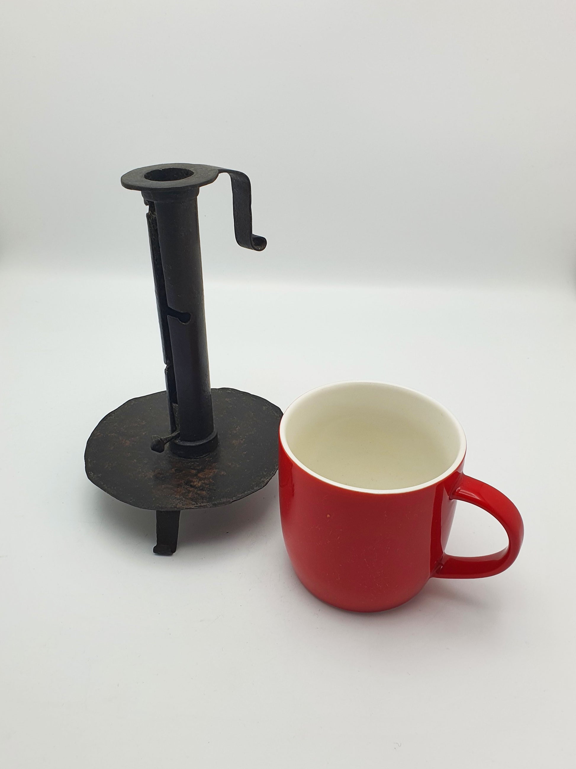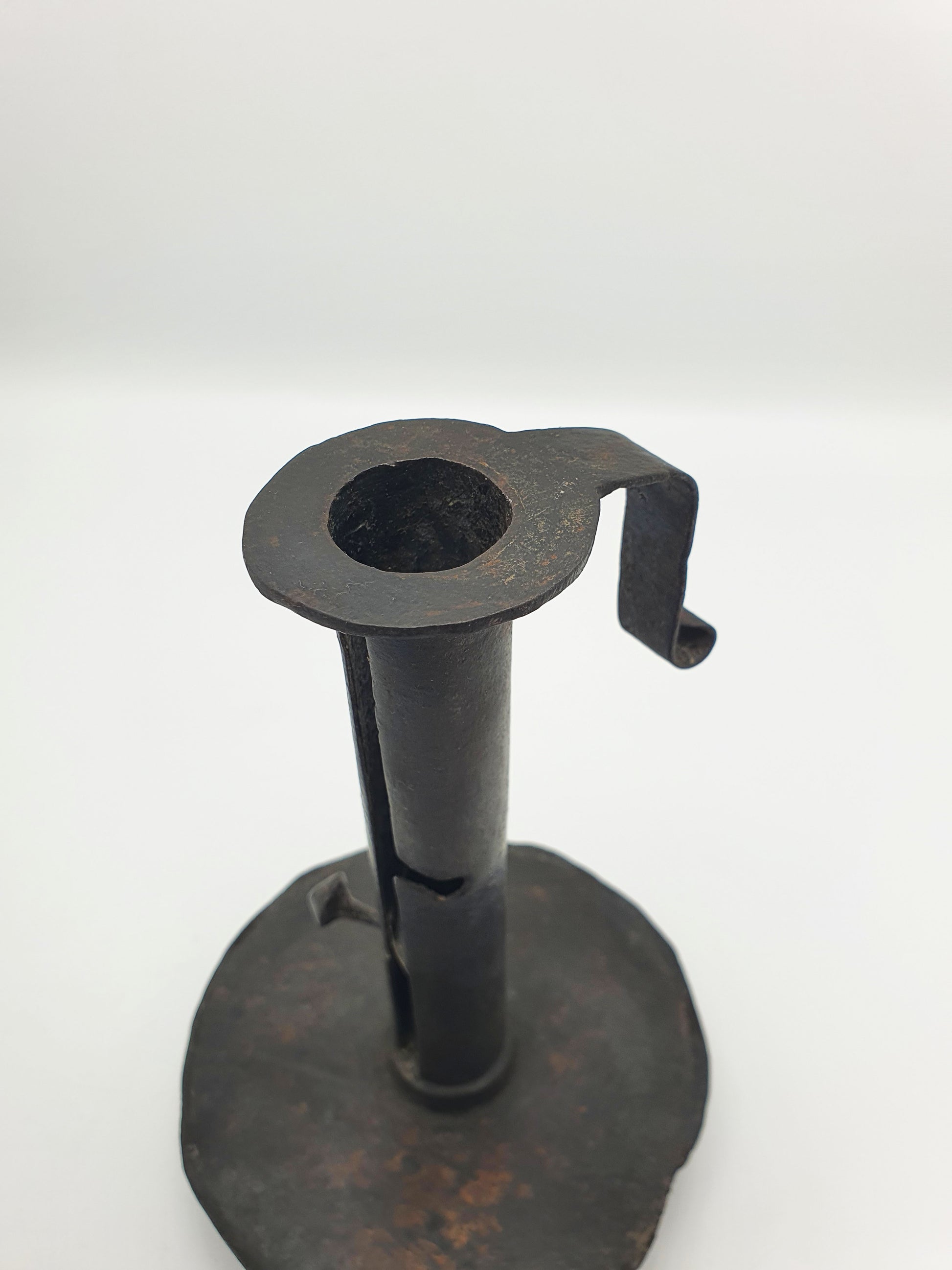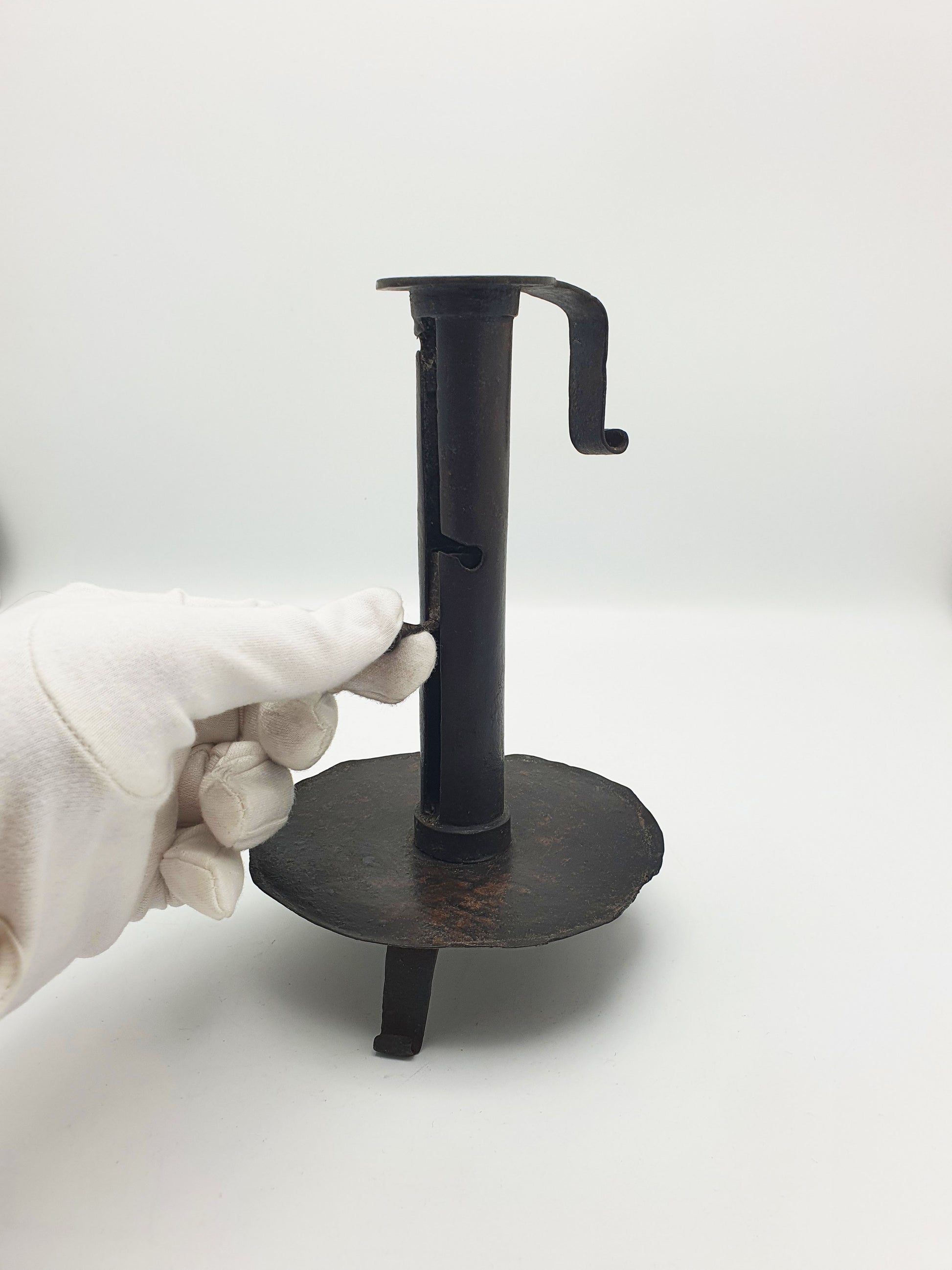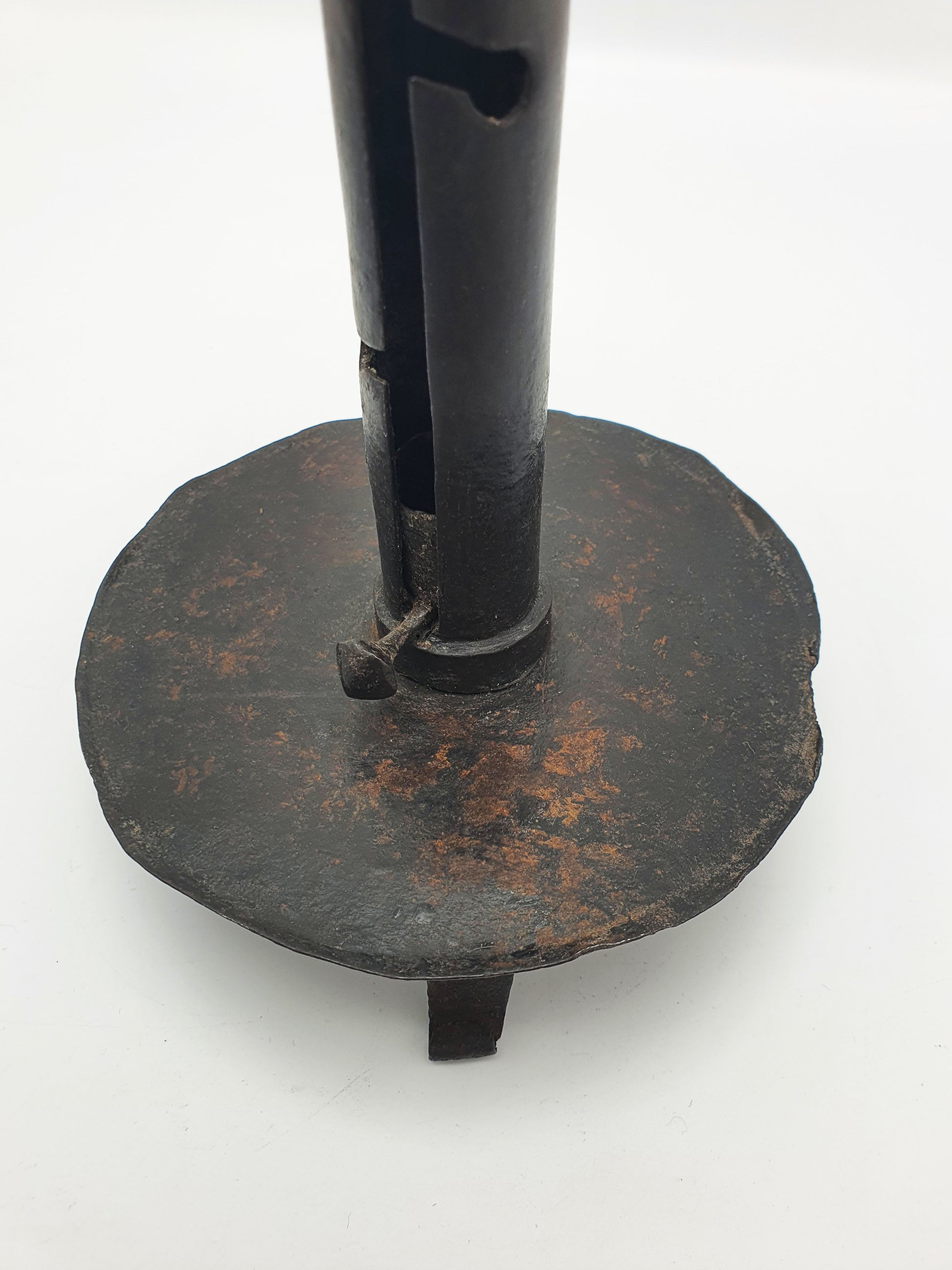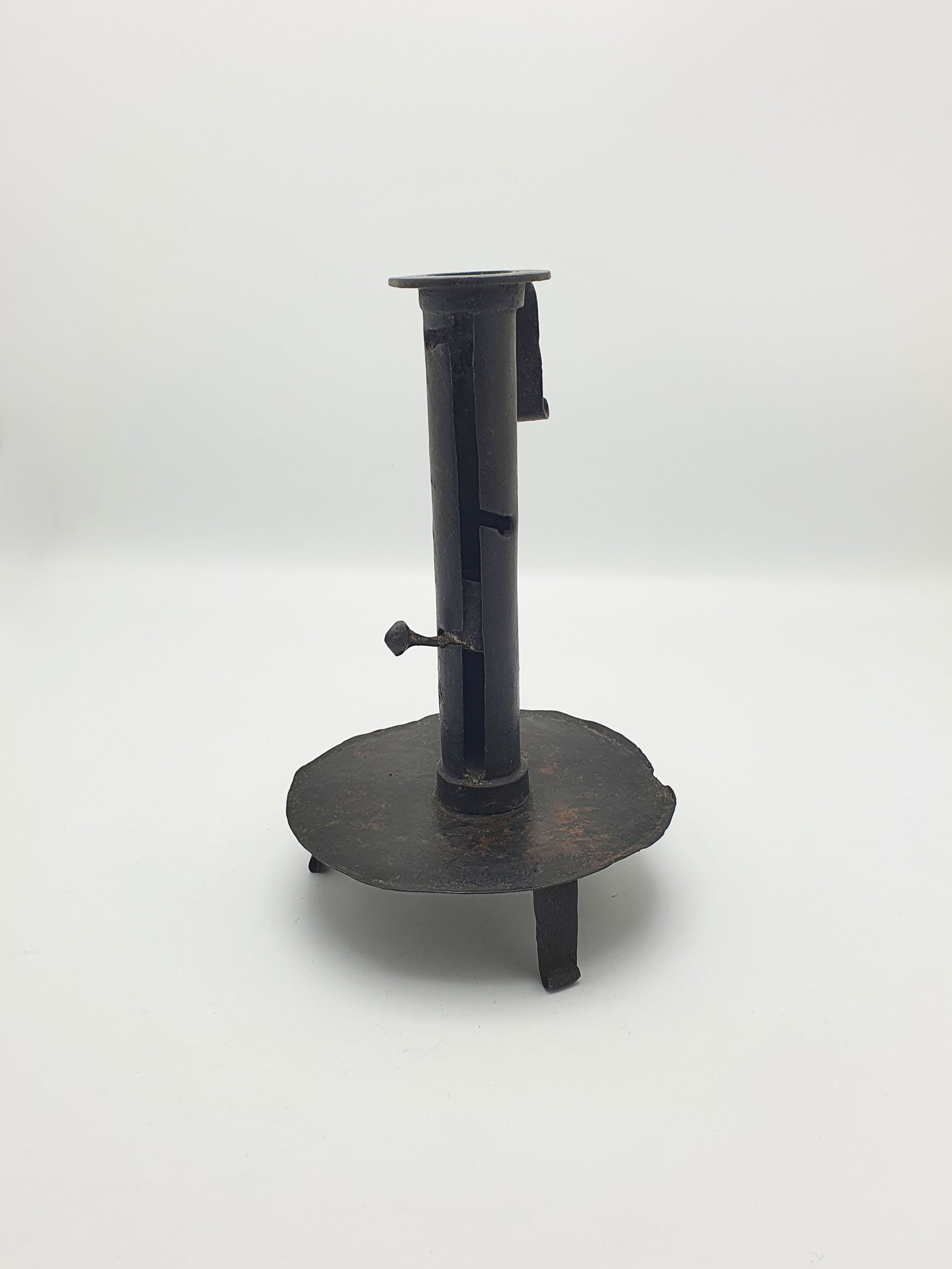 A Fabulous Continental Wrought Iron “Courting” Candlestick. Step back into the intimacy of the early 1700s with this rare wrought iron courting candlestick. Sometimes referred to as a “courting candle,” this ingenious design allowed a candle's height - and burn time - to be adjusted, often said to determine how long a suitor could stay during a visit. Whether or not this tale is myth or fact, the piece remains a captivating relic of rural domestic life and early lighting technology – circa 1700.