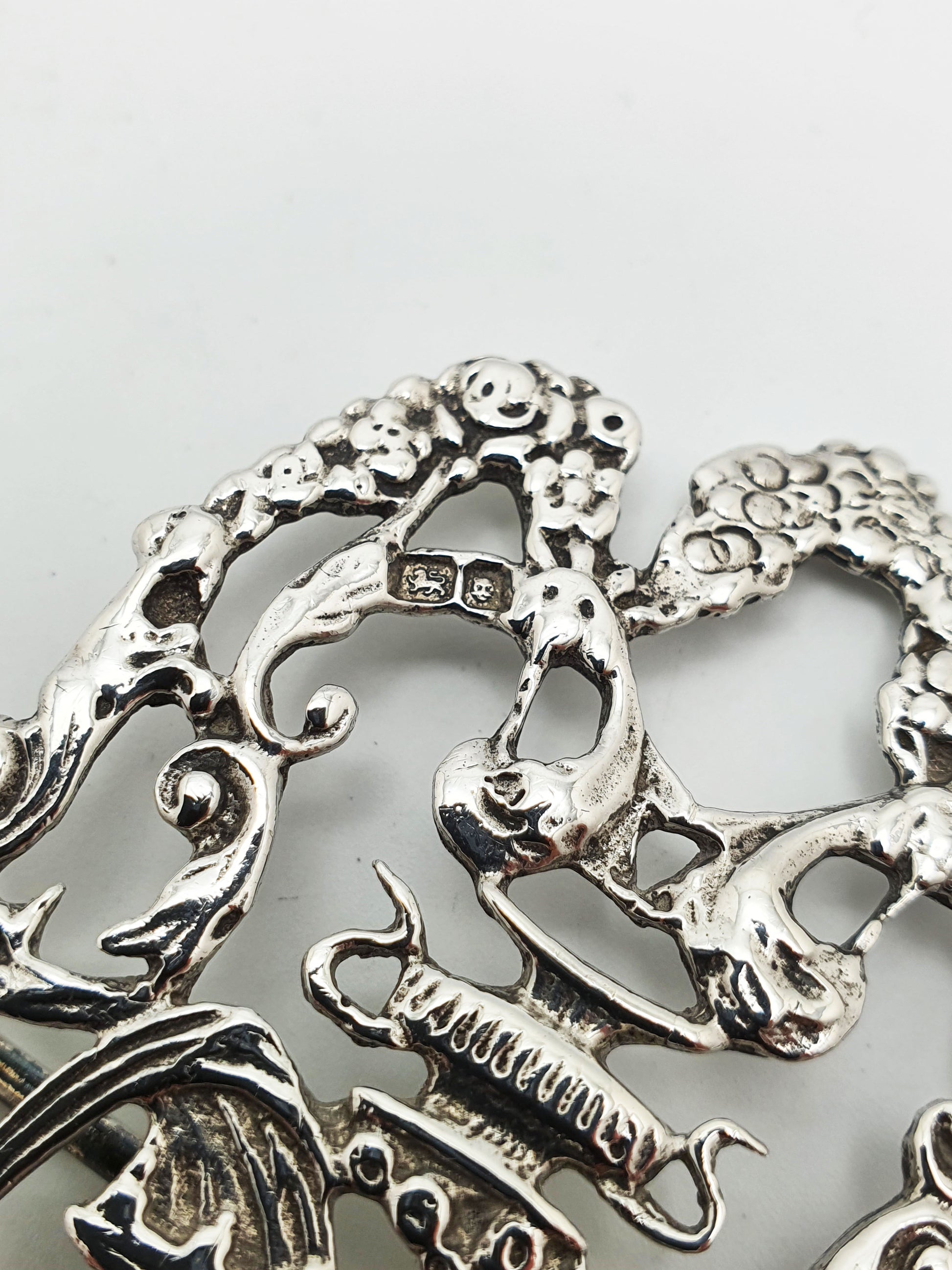A Fabulous Sterling Silver Nurses Belt Buckle in a pierced rococo style. Rich in detail, the buckle showcases a pair of mirrored halves that seamlessly unite with a central hook clasp. Flowing scrolls, cherubs, and floral elements dance across the surface, exemplifying the elegance and imaginative spirit of its Victorian style. Crafted using traditional casting and chasing techniques, each part was formed, polished, and pierced by hand. Hallmarked for London, 1967.