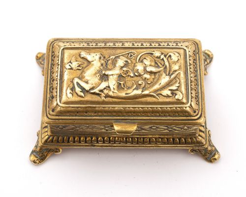 A fabulous English Victorian brass triple stamp box with three stamp compartments and nicely pierced and embossed picture of horse & rider on lid. Circa 1890. FREE UK worldwide delivery to most destinations Measurements: Height: 1 3/4 (approx 4. 5cm) Length: 3 1/2 (approx 9 cm) Width: 2 (approx 5.cm) Weight: 171g in good condition
