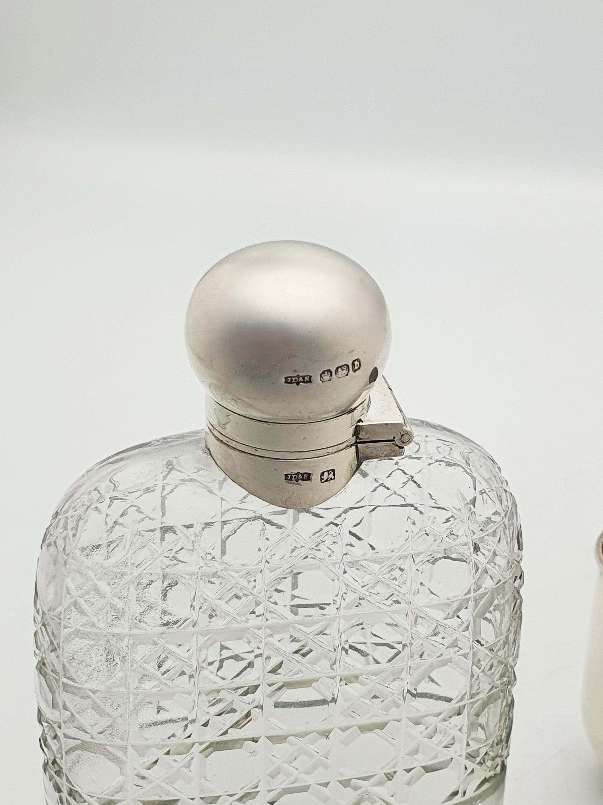 A Fabulous Large Antique Victorian Cut Glass and Sterling Silver Hip Flask. The cut glass body is richly patterned with a crosshatch and star motif that catches the light beautifully. The top section is fitted with a rounded, hinged silver cap, complete with a secure bayonet fitting and cork-lined interior. The removable silver cup base serves both as protection and a drinking vessel, sliding off smoothly and hallmarked to match. All silver elements bear Sheffield hallmarks, indicating quality sterling and dating the item to 1894.
