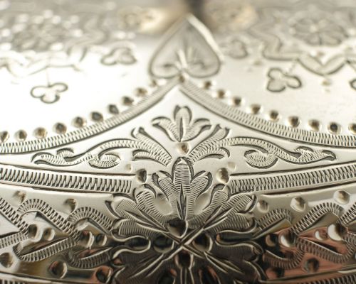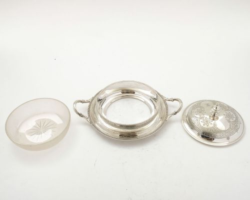 A Fabulous Victorian Silver tray based Butter Dish with handles to either side pull off lid and frosted glass liner with star cut base. The top and the sides are beautifully engraved and marked J B for Jacob Berman and hallmarked for London 1884. FREE UK & Worldwide Delivery Measurements. Height with lid of 3 ( approx. 7.5 cm ) Base handle to handle 9 3/4 ( approx. 24.5 cm ) Diameter across top 5 3/4 ( approx. 14.5 cm ) Silver weight 360g - 11.6 troy ounces Total weight inc. liner 615 g In good condition - any dark areas are from the photography - no chips or cracks to the glass liner.