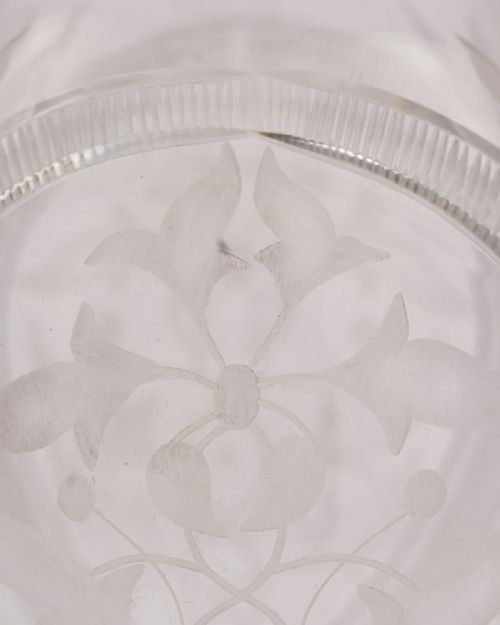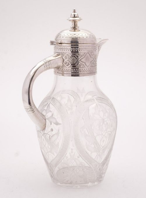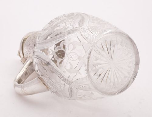 A fabulous English Victorian silver plated claret jug with etched decoration to glass body and star cut base. Has silver plated flip-up lid & handle which has engraved decoration. Circa 1880. FREE worldwide delivery. Measurements: Height: 11 (approx 28cm) Length (to handle): 5 (approx 12.5cm) Diameter across base: 3 (approx 7.5cm) Weight: 1120g In good condition - any dark areas are shadows from the photography there is no damage to the silver plate and no chips or cracks to glass.