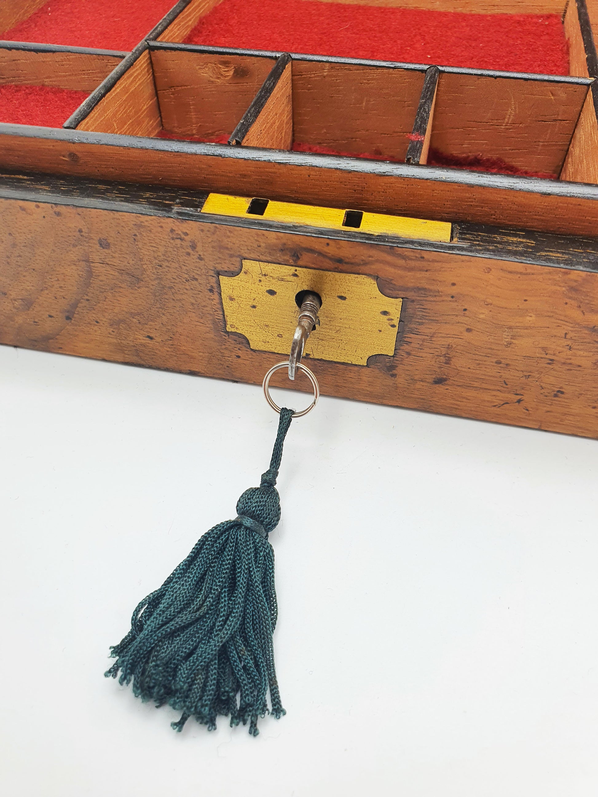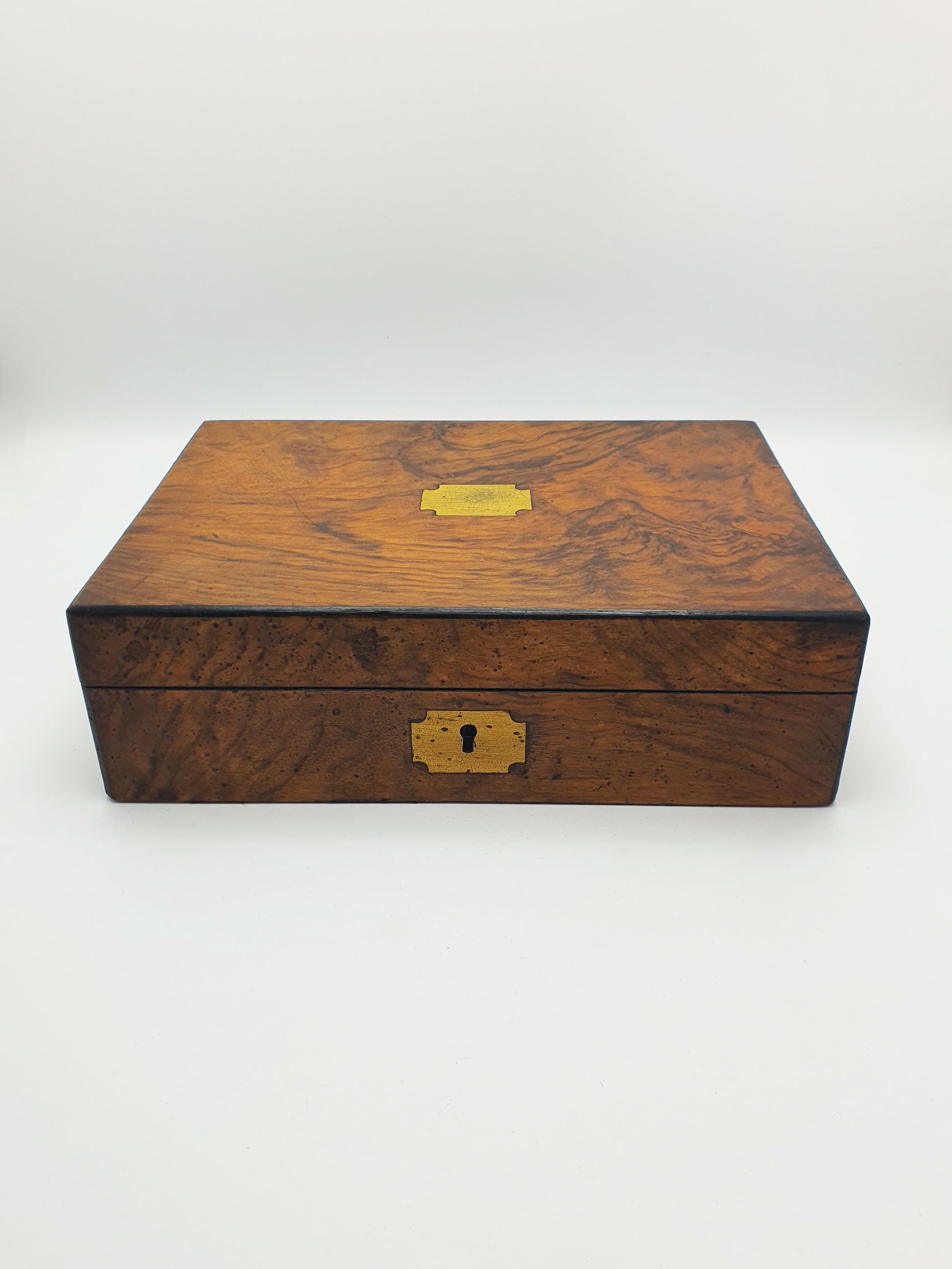 A Fantastic Antique Victorian Burr Walnut Jewellery or Collectors Box featuring a warm, richly grained walnut exterior accented with a classic inset brass nameplate and escutcheon. The hinged lid opens to reveal a fitted interior, divided into multiple compartments - perfect for jewellery, keepsakes, or coins. Complete with working lock and tasselled key, this piece is a refined example of Victorian craftsmanship and practicality – circa 1890.