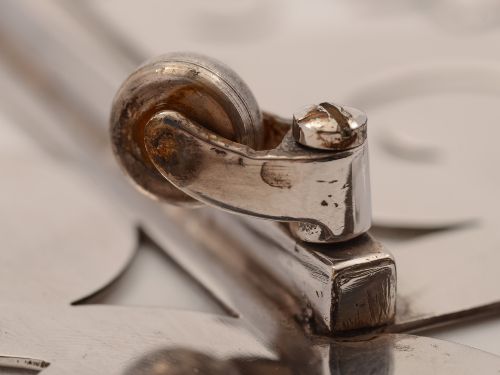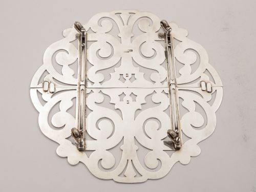 A nice French silver plated adjustable table trivet which stands on four small castors and has lovely engraved decoration to top. Marked Marche Paris. Circa 1900. Worldwide first class tracked and signed for delivery is included in the price. Measurements: Closed length: 10 (approx 25cm) Extended length: 13 3/4 (approx 35.5cm) Width: 10 (approx 25cm) Weight: 484g In good condition - any dark areas are shadows from the photography there is no wear to the silver plate.