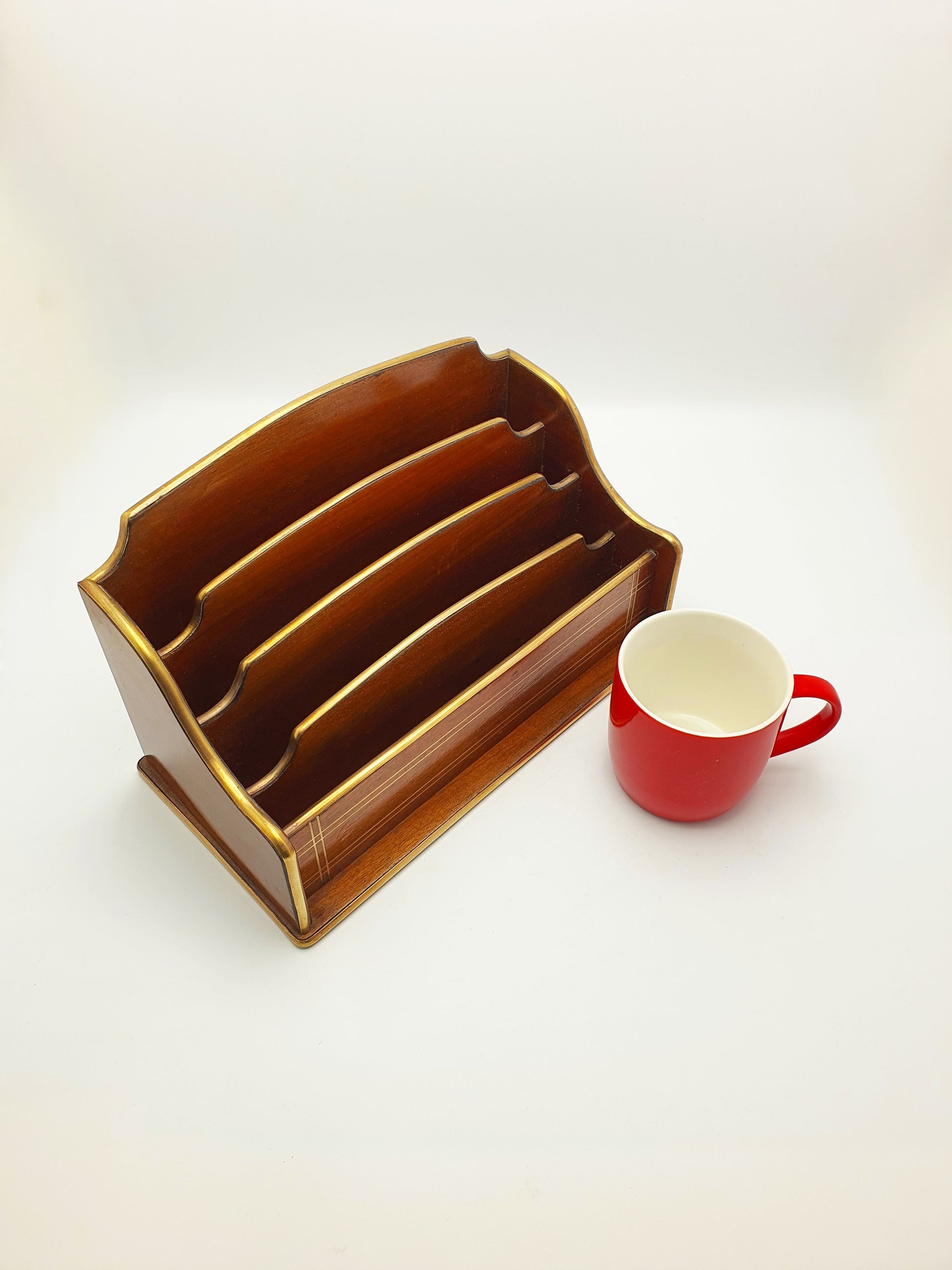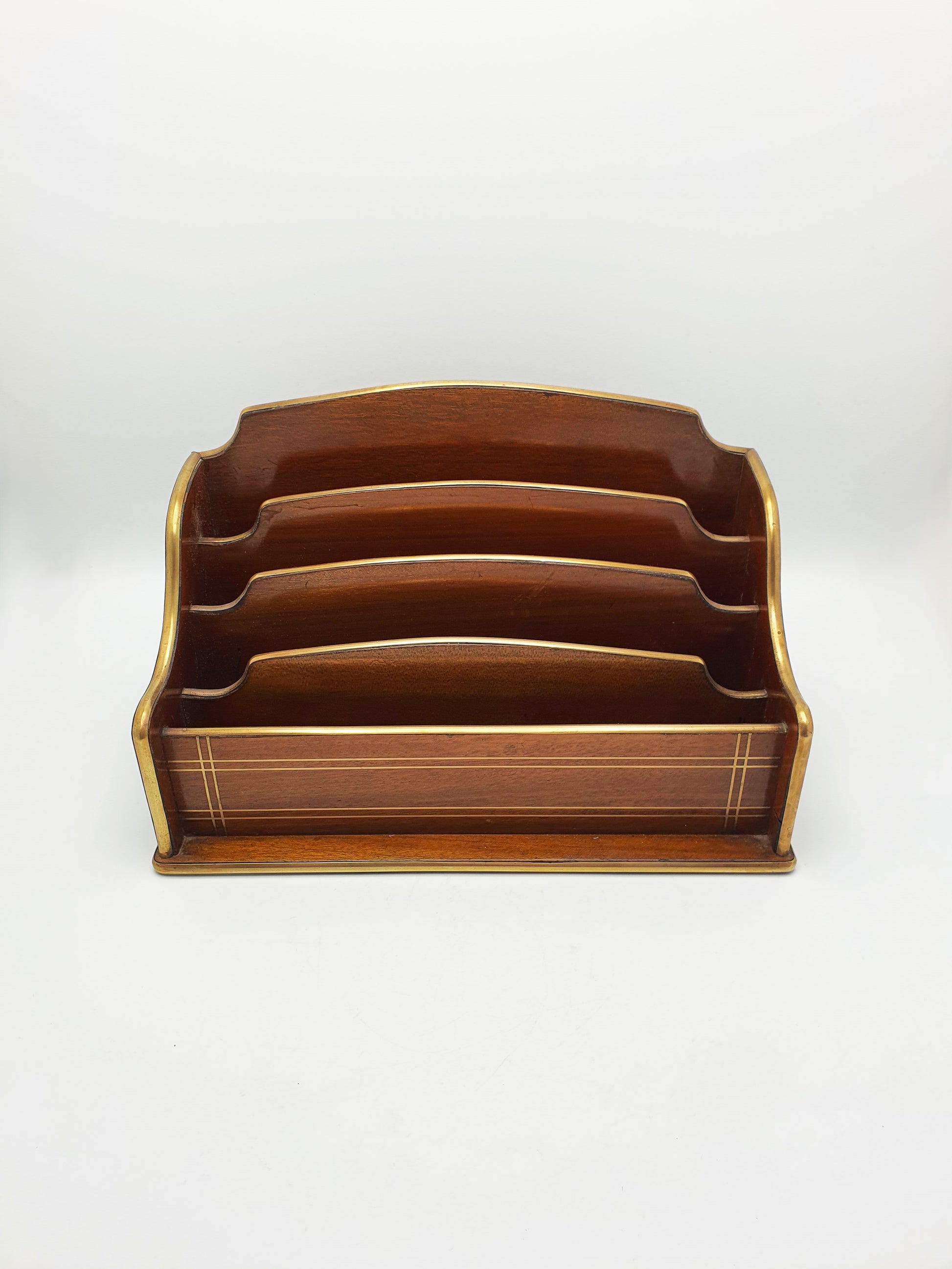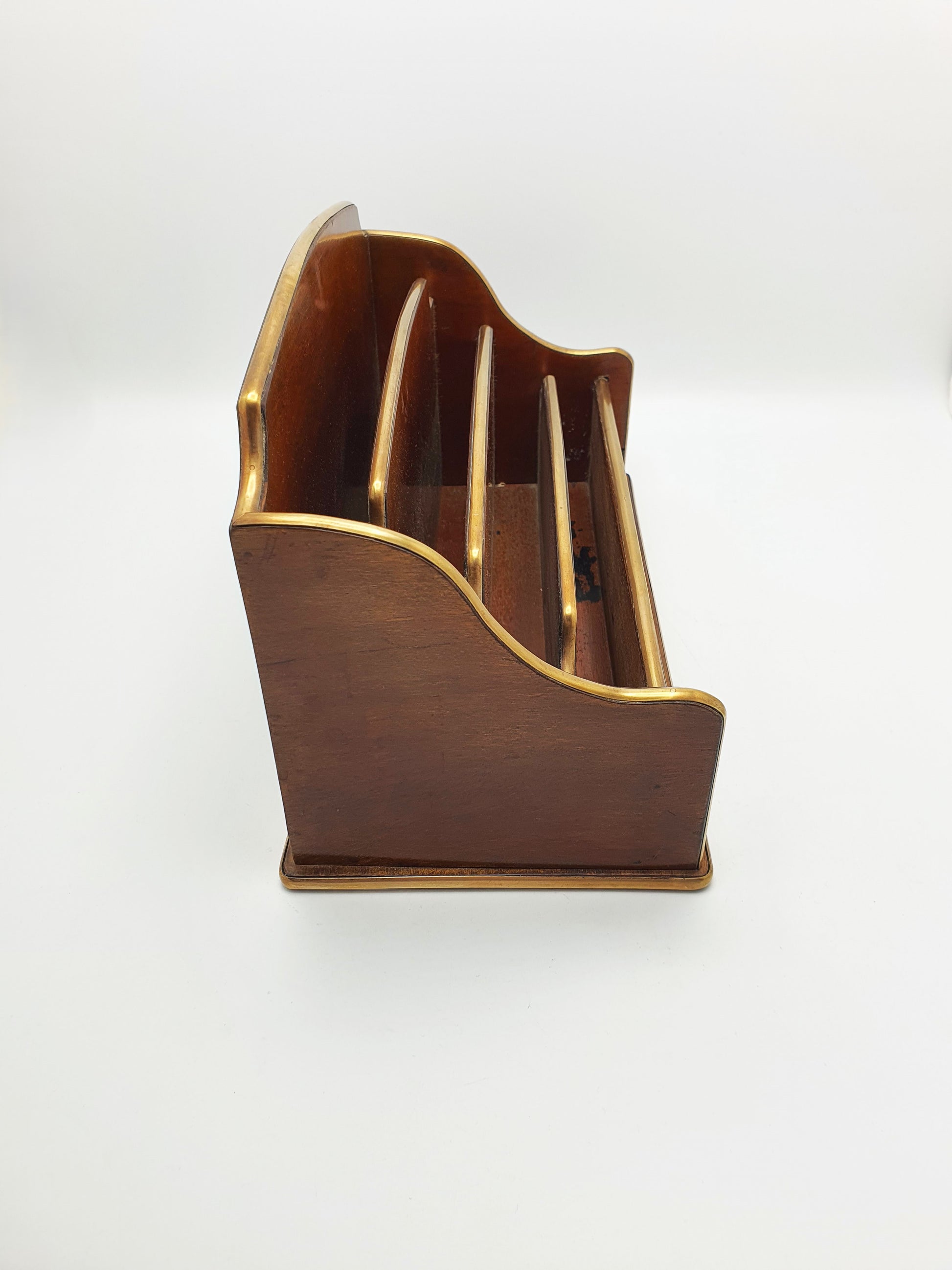 A French Antique Mahogany Document Rack with graduated tiers and brass bound edges. Each section increases slightly in height for improved visibility and organisation of letters, papers, or cards. The mahogany has mellowed beautifully with age, showing a warm reddish-brown tone and fine grain – circa 1920.