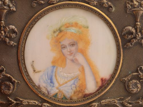 A pretty French brass jewellery casket with embossed decoration and central round painting of lady in early 19th century costume under glass. The picture is signed Devval and the box has original blue velvet lining circa 1880. Worldwide first class tracked and signed for delivery is included in the price. Measurements: Height: 1 1/2 (approx 4cm) Length: 4 3/4 (approx 12cm) Depth: 3 1/2 (approx 9cm) Total weight 414g The lady in the painting is possible modelled on Napoleons mistress Josephine. In good condition