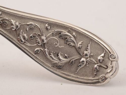 A good solid pair of French silver salad servers with beautiful cast decoration to ends which are marked with the initial D. The bottom halves have their original gilding and are marked with with the French Minerva mark for silver. Circa 1900. Measurements: Length: 11 (approx 28cm) Total weight: 211g (6.8 troy ounces) First class quality - would make a superb gift! In good condition