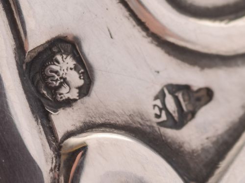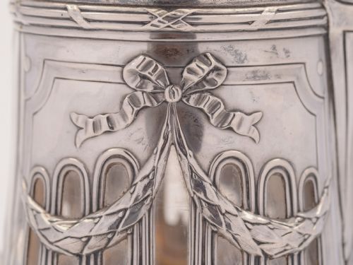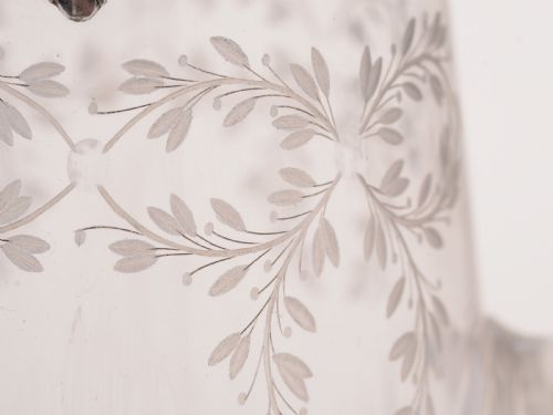 A fabulous French silver topped jug/pitcher with glass strap handle. The body has etched flower design with fluted design to base of glass. The silver top has pierced and swag design with French Minerva mark. Has star cut base circa 1900. FREE worldwide delivery. Measurements: Height: 12” (approx. 30cm) Length: 3 ½” (approx. 8.75cm) Diameter across base: 3 ½” (approx. 8.75cm) Total weight: 1683g In good condition - any dark areas are shadows from the photography there is no damage to the silver and no hips or cracks to glass.
