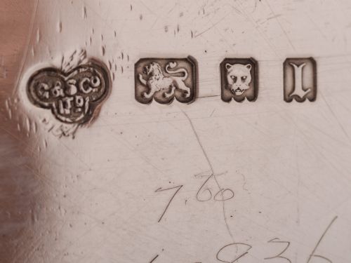 A nice English George V silver ink stand with cut glass ink pot which has a silver top and sits on silver stand dish. The Dish has a pen tray to the front and sits on 4 scroll feet. Hallmarked London 1926 and marked G & S Co Ltd for the renowned maker Goldsmiths and Silver smiths Ltd London. Worldwide first class tracked and signed for delivery is included in the price. Measurements: Stand: Height: 1 (approx 2.5cm) Length: 6 1/2 (approx 16.5cm) Width: 4 1/2 (approx 11.5cm) Ink pot: 2 square (approx 5cm) Total weight: 394g In good condition - any dark areas are shadows from the photography and there are no chips or cracks to glass ink pot.