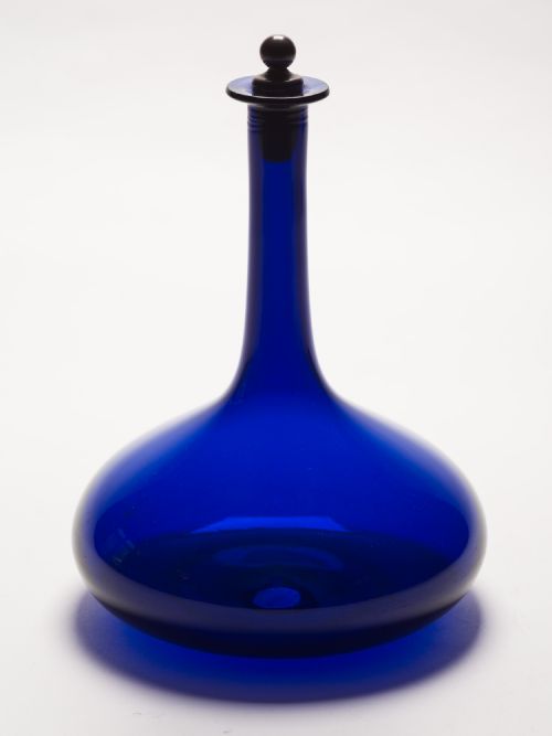 Georgian Bristol blue onion-shaped decanter with a cork and copper stopper. Circa 1800. Dimensions 9 high X 7 at widest point. In good condition.