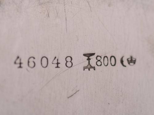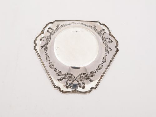 An unusual German .800 silver three-sided dish with embossed ribbon and garland decoration. Has German .800 silver mark to back. Circa 1900 FREE worldwide delivery. Measurements: Height: 1 (approx 2.5cm) Length: 7 (approx 17.5cm) Width: 7 (approx 17.5cm) Weight: 198g (approx 6.4 troy ounces) In good condition - any dark areas are shadows from the photography