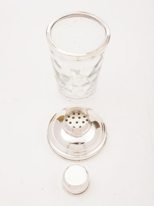 A gorgeous English dimple patterned glass & silver plated cocktail shaker with matching ice bucket with ice tongs. Circa 1930. FREE worldwide delivery. Measurements: Shaker height: 9 (approx 22.5cm) Shaker diameter (top): 4 1/2 (approx 11.25cm) Ice bucket height: 5 1/2 (approx 13.75cm) Ice bucket diameter across top: 5 (approx 12.5cm) Tong length: 6 (approx 15cm) Total weight: 1279g In good condition - any dark areas are shadows from the photography there is no damage to the silver plate and no chips or cracks to glass
