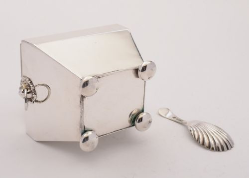 A good English Edwardian silver plated tea caddy in the Georgian stile with lion mast ring handles sits on 4 bun feet has hinged lid and comes with embossed silver plated caddy spoon. Circa 1905 FREE worldwide delivery. Measurements: Height: 6 ¼” (approx. 15.5cm) Length: 4” (approx. 10cm) Width: 3 ½” (approx. 8.75cm) Caddy spoon length: 3 ½” (approx. 8.75cm) Weight: 378g In good condition - any dark areas are shadows from the photography there is no damage to the silver plate.