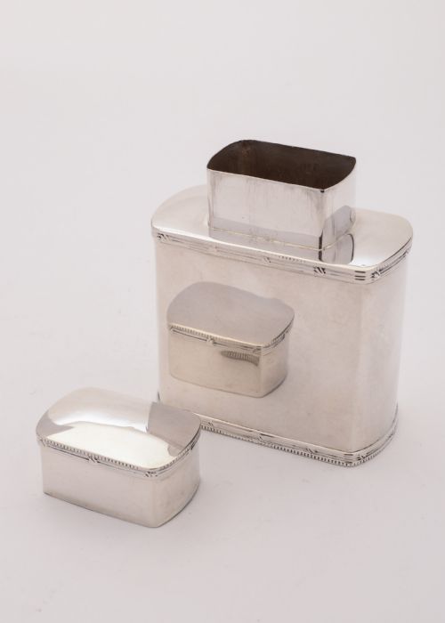 A good English silver tea caddy with pull-off lid embossed pattern to top of the lid and top and bottom of body. Hallmarked Birmingham 1913 FREE worldwide delivery. Measurements: Height: 3 3/4 (approx 9.5cm) Length: 3 (approx 7.5cm) Width: 1 1/2 (approx 3.75cm) Weight: 139g (approx. 4.5 troy ounces) In good condition - any dark areas are shadows from the photography there is no damage to the silver.