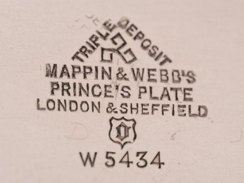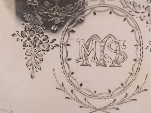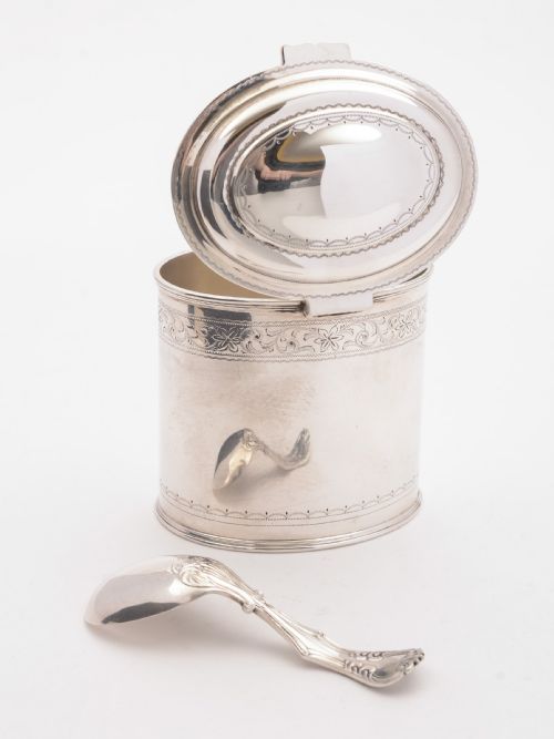 A good English Victorian silver plated oval tea caddy with hinged lid and engraved decoration including initials M M S to centre. Comes with tea caddy spoon and made by the renowned makers Mappin & Webb Sheffield England. Circa 1890 FREE worldwide delivery. Measurements: Height: 4 ¼” (approx. 10.5cm) Length: 4” (approx. 10cm) Width: 3 ½” (approx. 8.75cm) Weight: 346g In good condition - any dark areas are shadows from the photography there is no damage to the silver plate.
