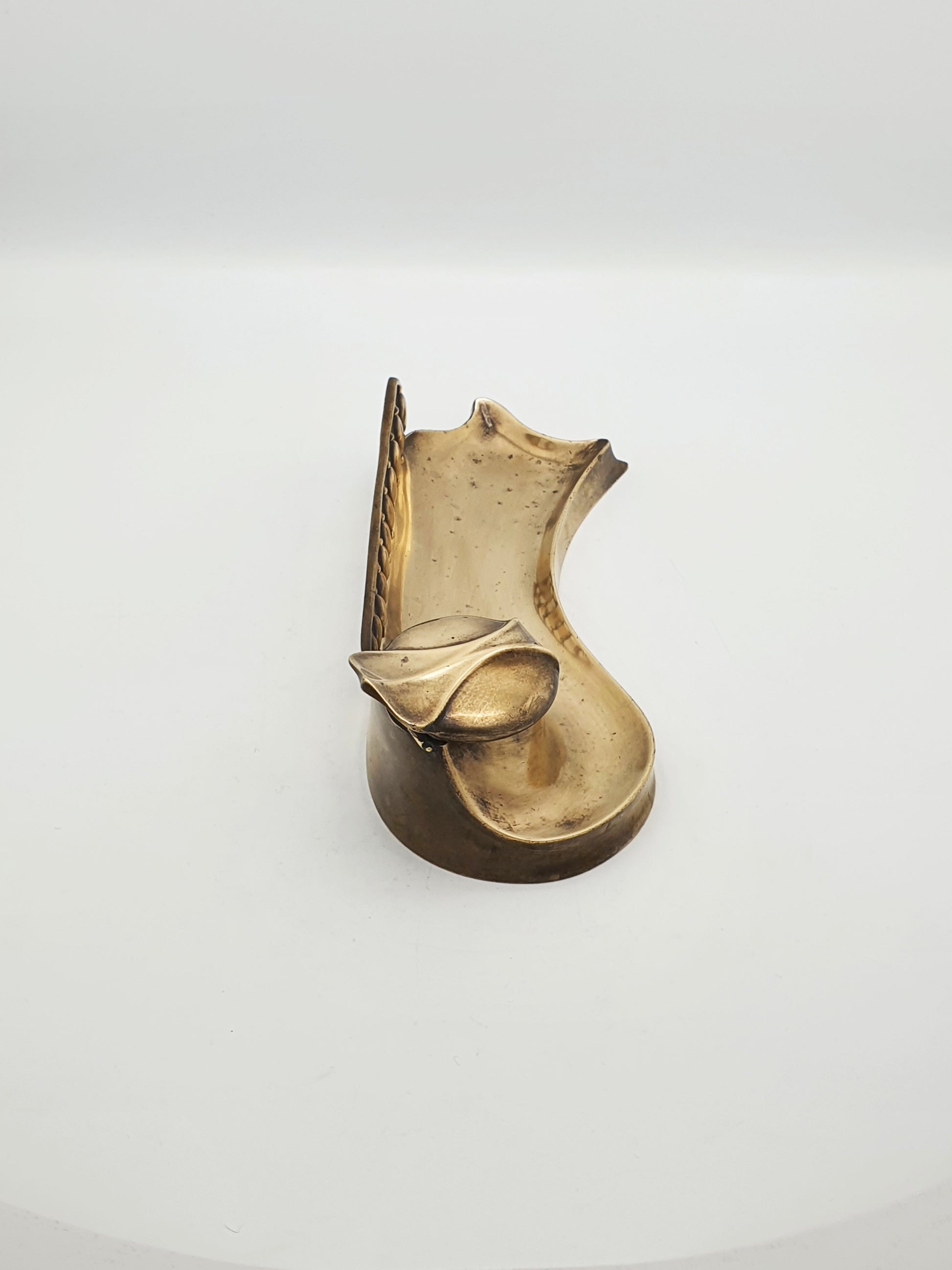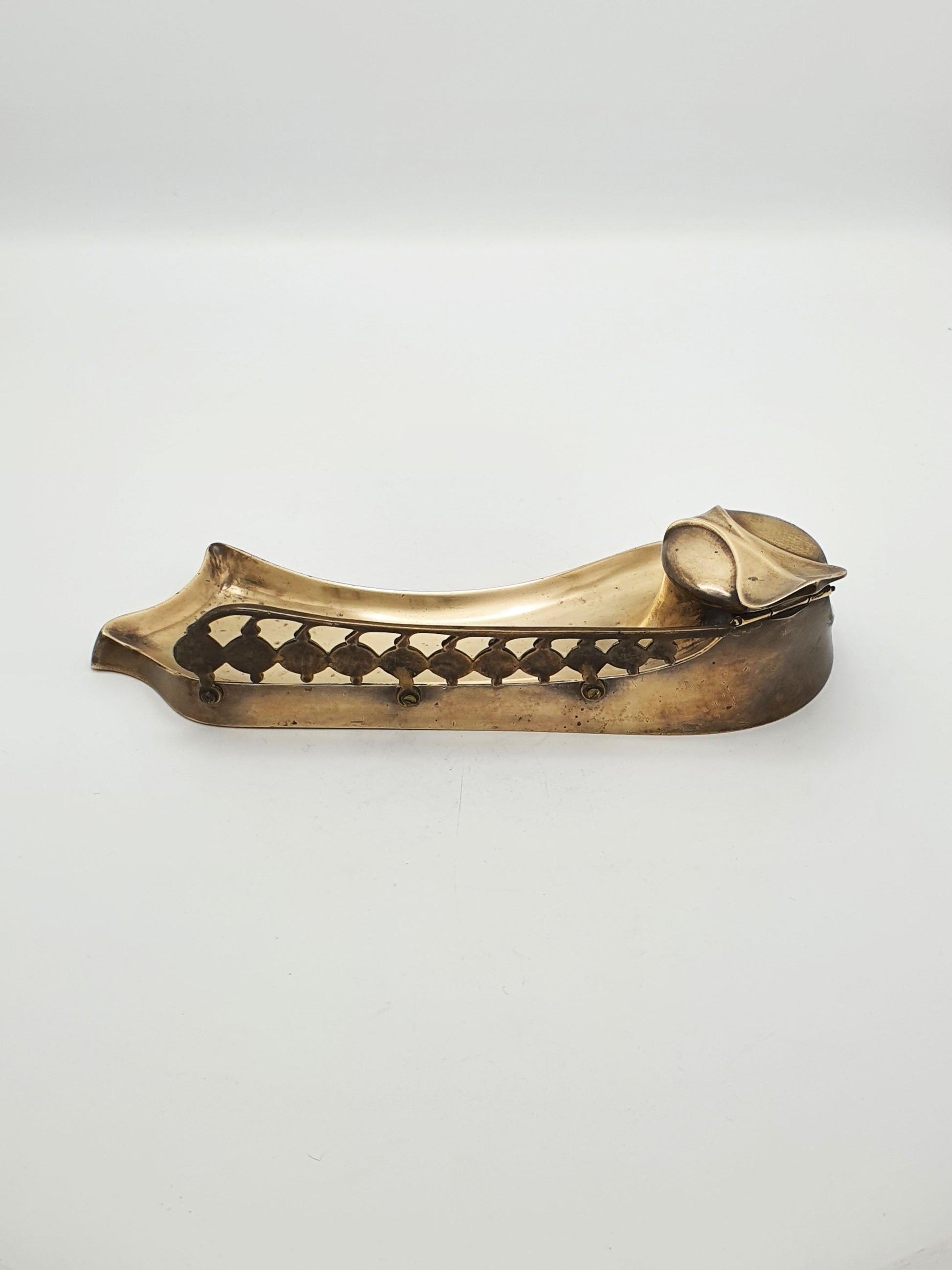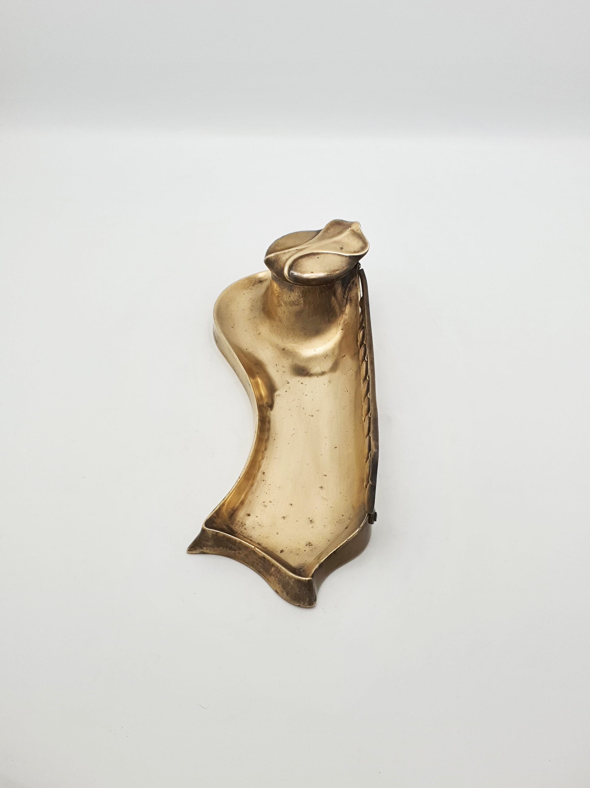A Gorgeous Antique Art Nouveau Bronze Inkwell with Pen Rest. Curvaceous and elegant, this antique brass inkwell is a beautiful example of early 20th-century Art Nouveau design. With its fluid, organic lines and stylized nature-inspired form, it features a hinged-lid inkwell with a removable glass liner, integrated into a pen tray. The asymmetrical, sweeping lines and soft curves reflect the Art Nouveau aesthetic, mimicking natural movement and plant-like forms – circa 1890.