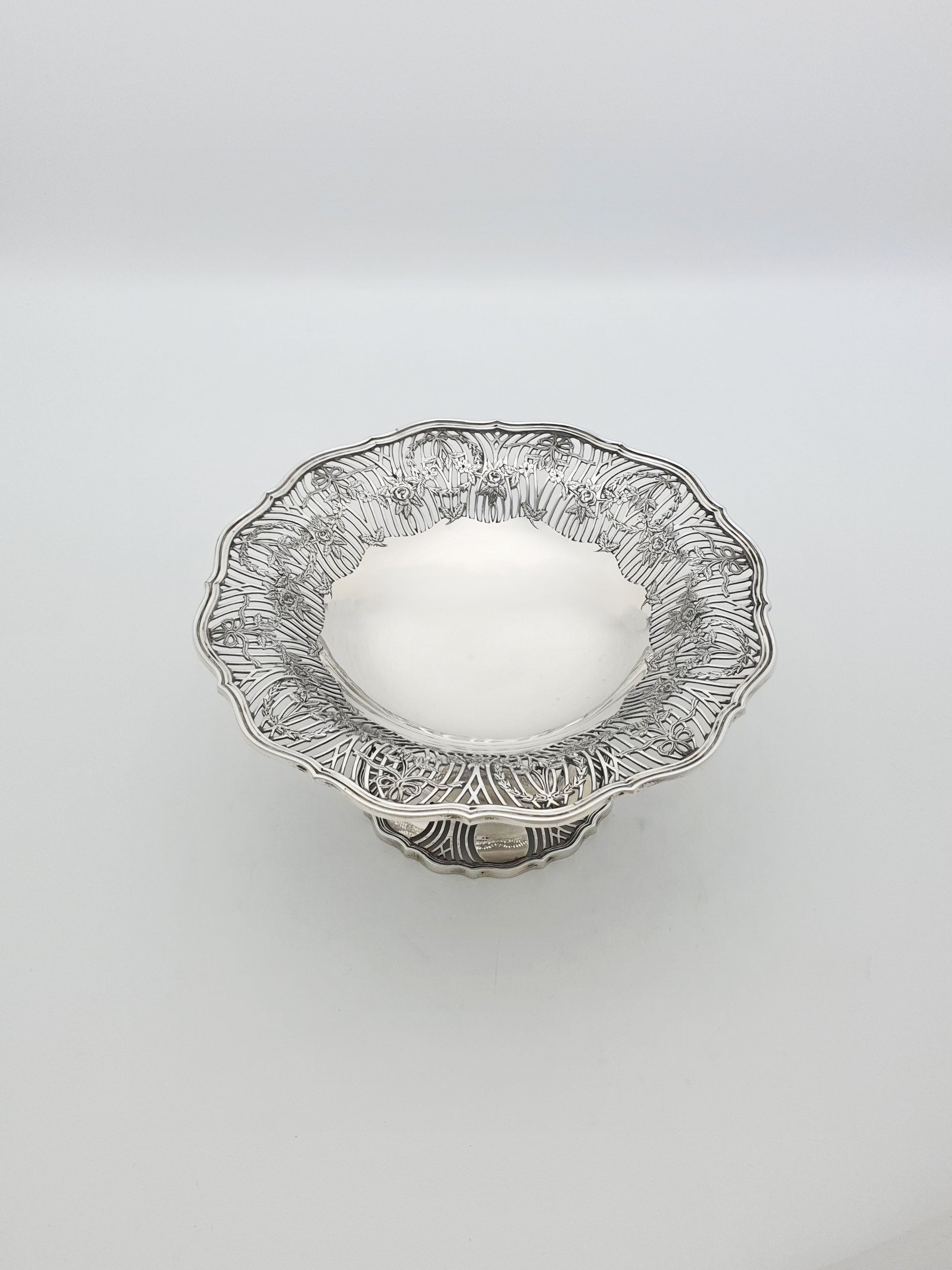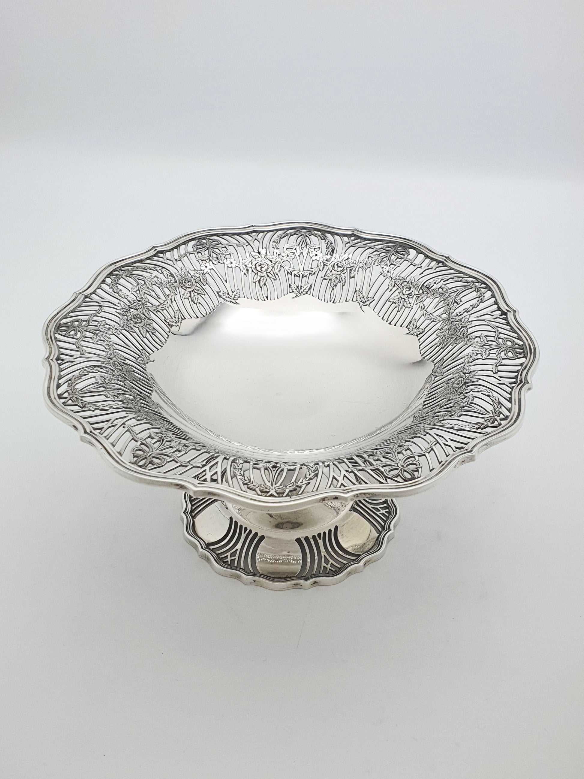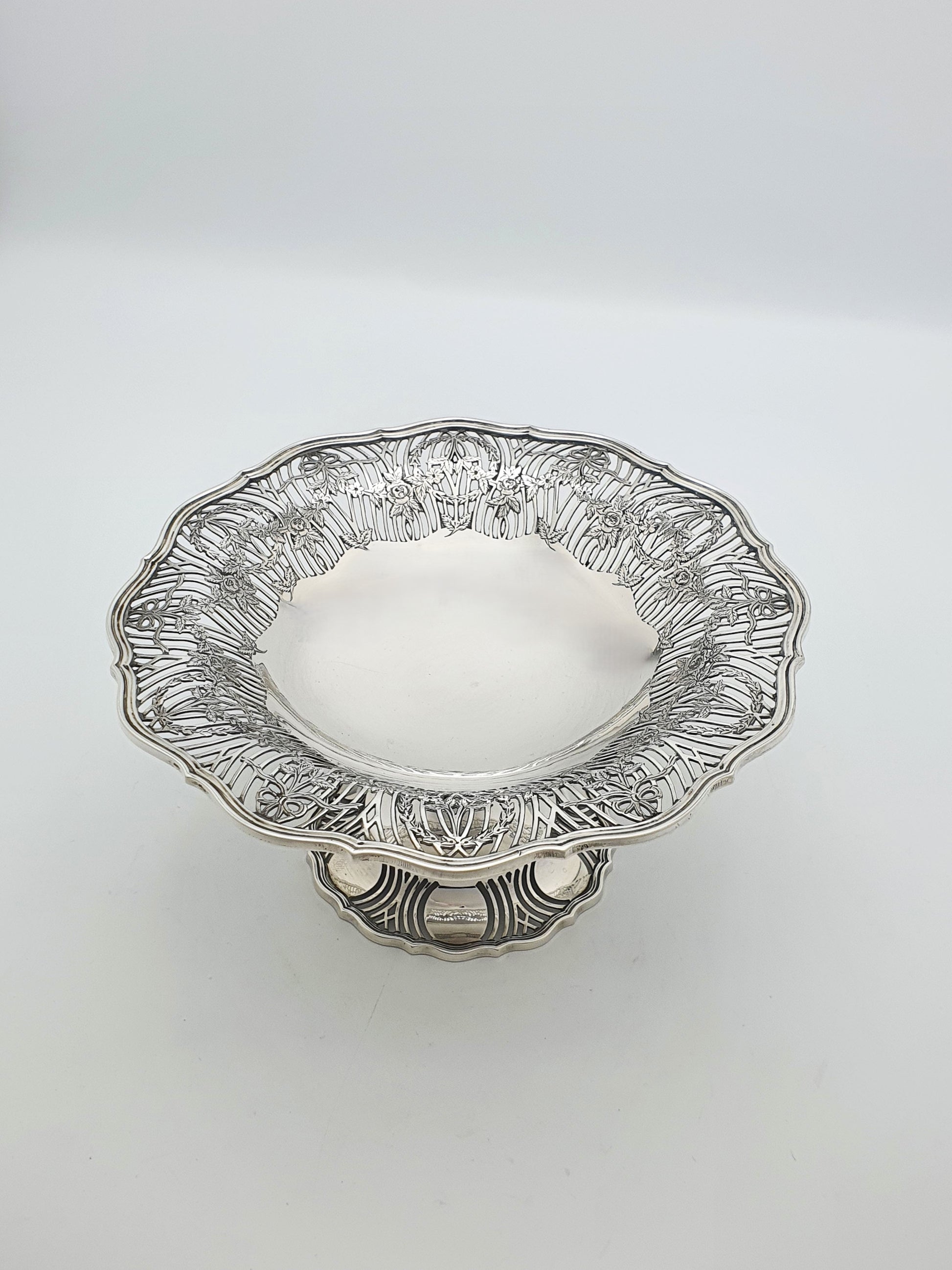 A Gorgeous Antique George V Sterling Silver Comport featuring hand-pierced garlands, swags, and floral wreaths encircling the rim in a beautifully open worked pattern. With scalloped edges, and a raised pedestal base, this piece exemplifies the grace and sophistication of early 20th-century English silverware. Hallmarked for Sheffield, 1913 and marked for the renowned makers William Hutton & Sons.