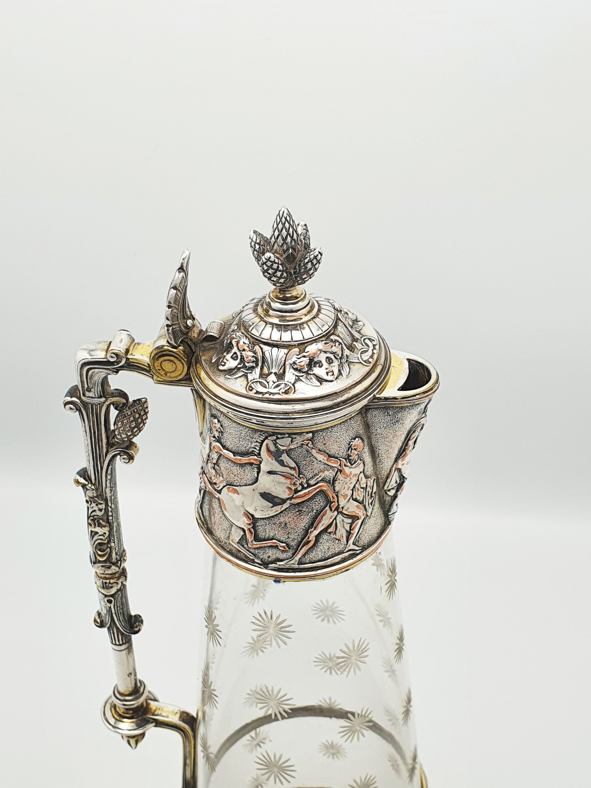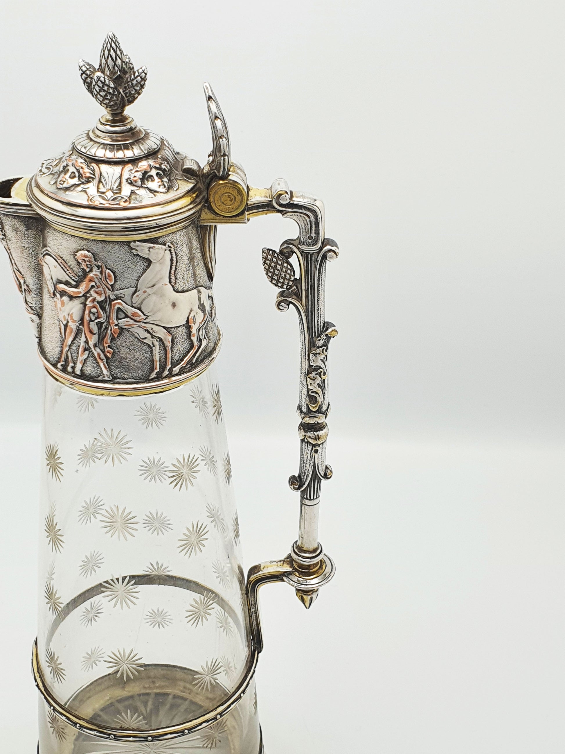 A Gorgeous Antique Elkington Etched Glass & Silver-Plated Claret Jug showcasing a magnificent blend of neoclassical elegance and Victorian craftsmanship. The lid and collar depict figures in motion - dancers, horses, and musicians - reminiscent of Greco-Roman friezes, with subtle copper-toned highlights enhancing the depth and drama.