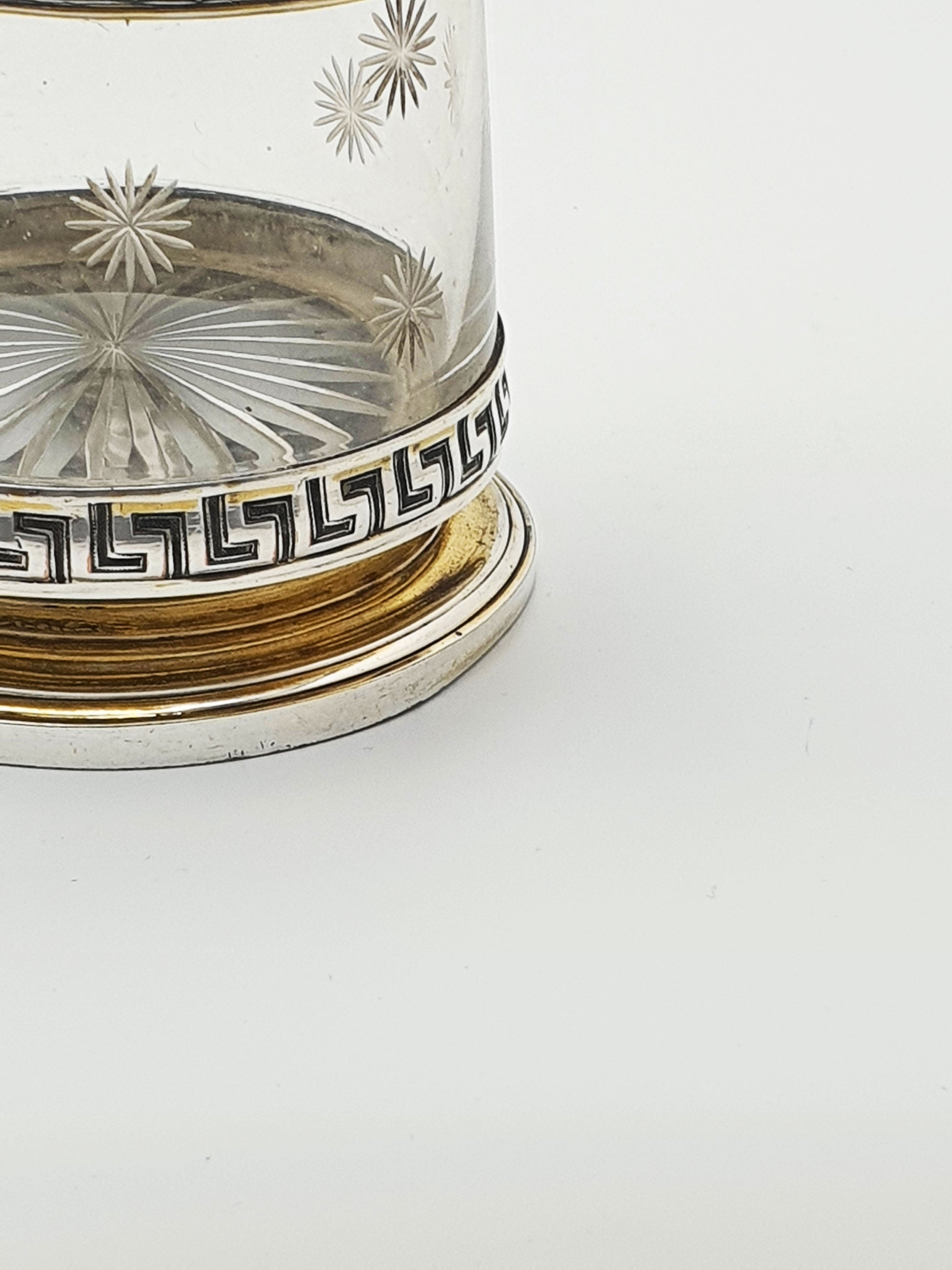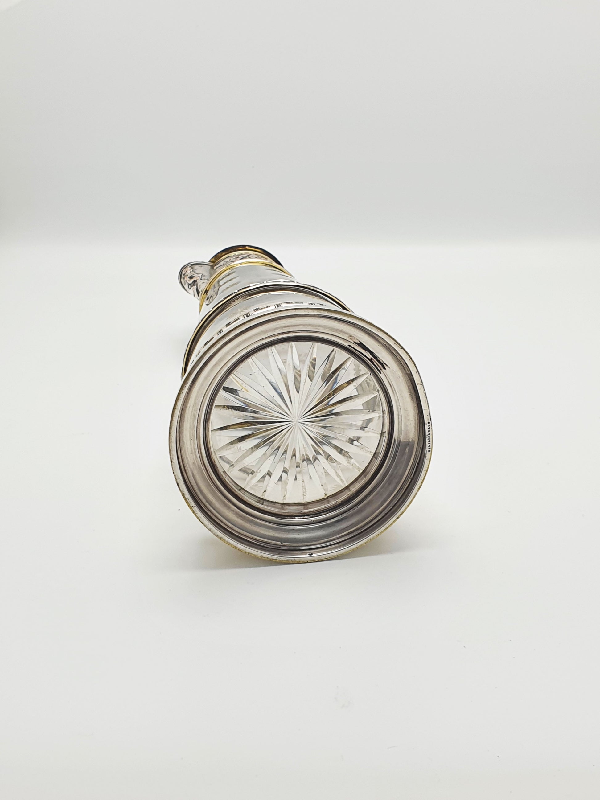 The inside of the lid and pour spout are finished in a warm gilt tone, often used to protect the contents and enhance the luxurious feel and the lower rim is embellished with a Greek key pattern, grounding the piece in neoclassical aesthetic tradition. The base is marked for the renowned maker ‘Elkington’ – circa 1870.