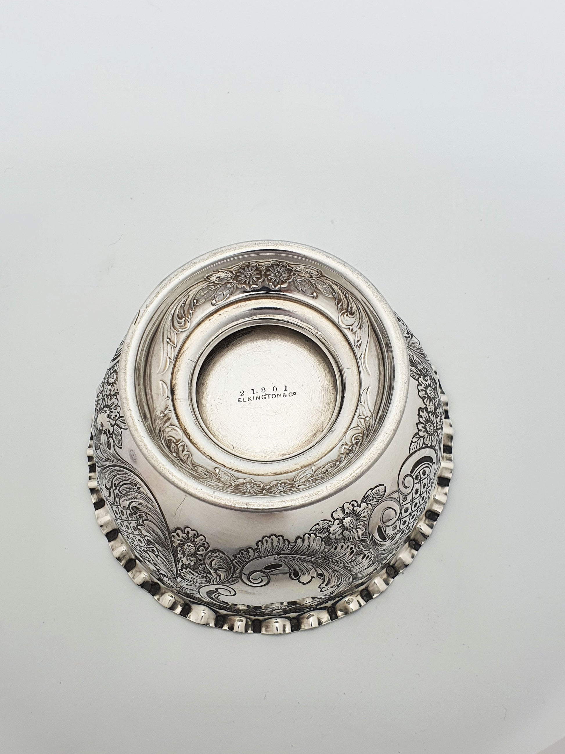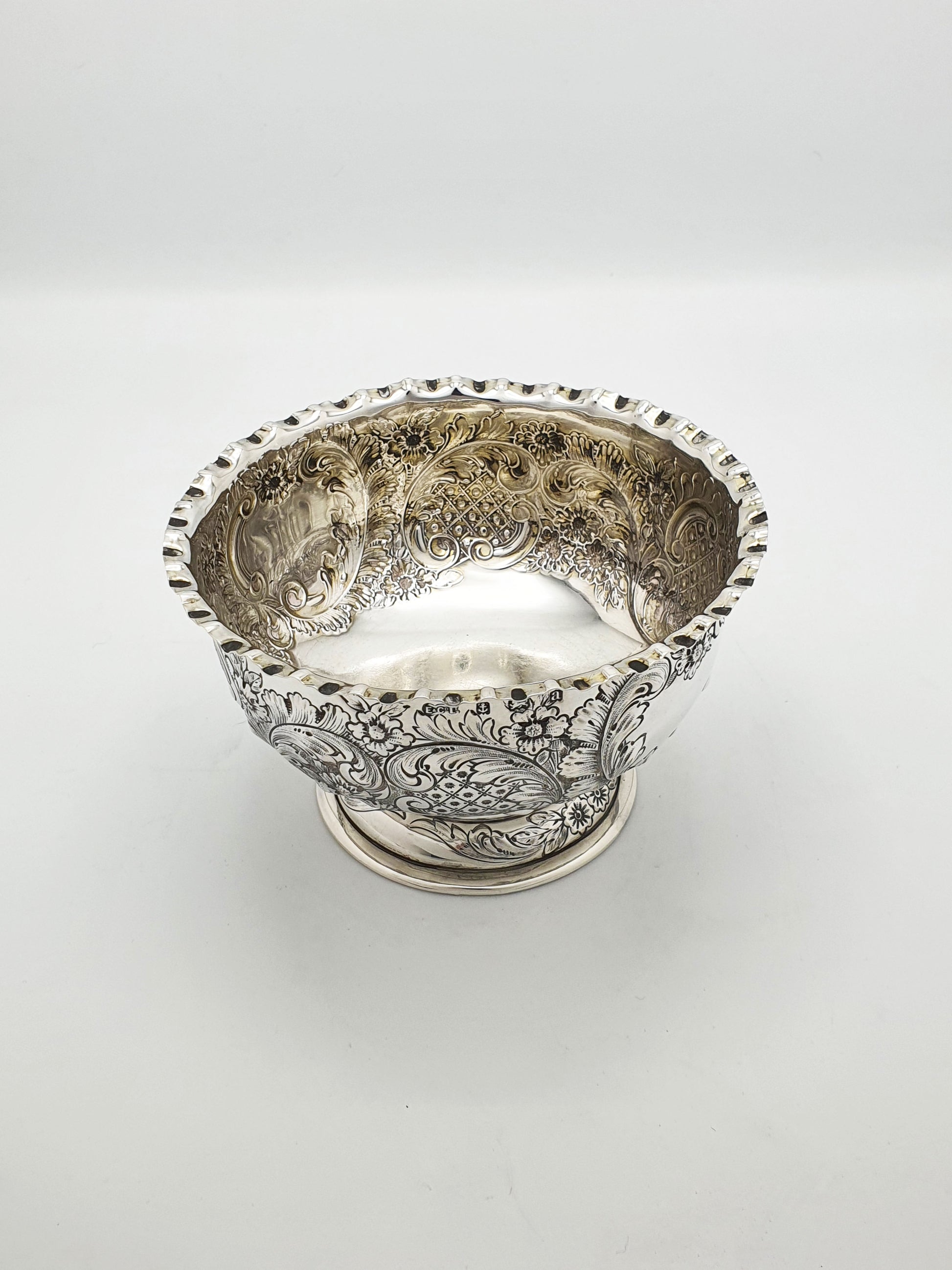 A Gorgeous Antique Victorian Sterling Silver Bowl by Elkington & Co featuring a richly embossed floral and foliate design with reserved cartouches and a delicately fluted rim, all resting on a raised circular foot for an elegant silhouette. Hallmarked for Birmingham, 1900.