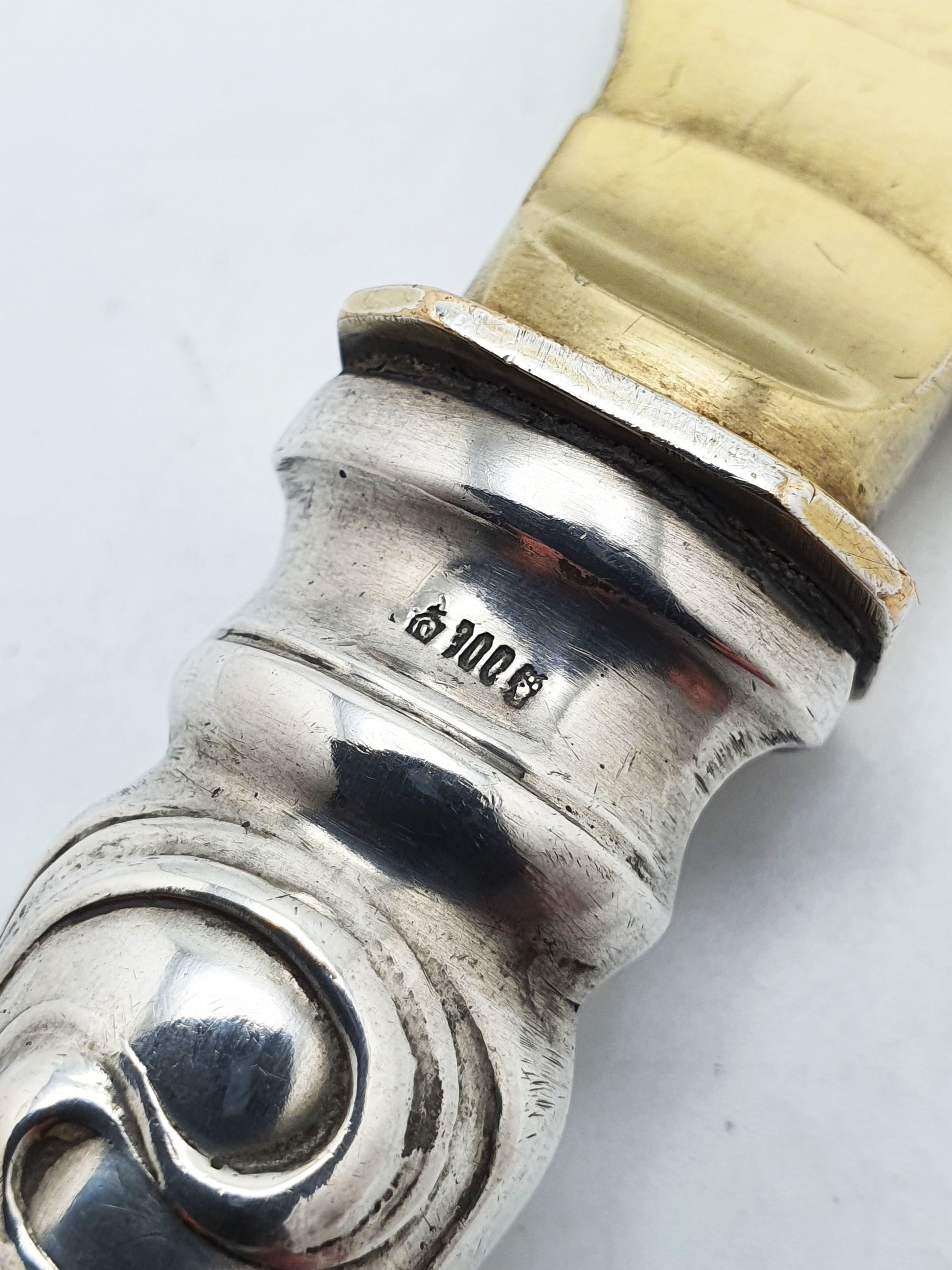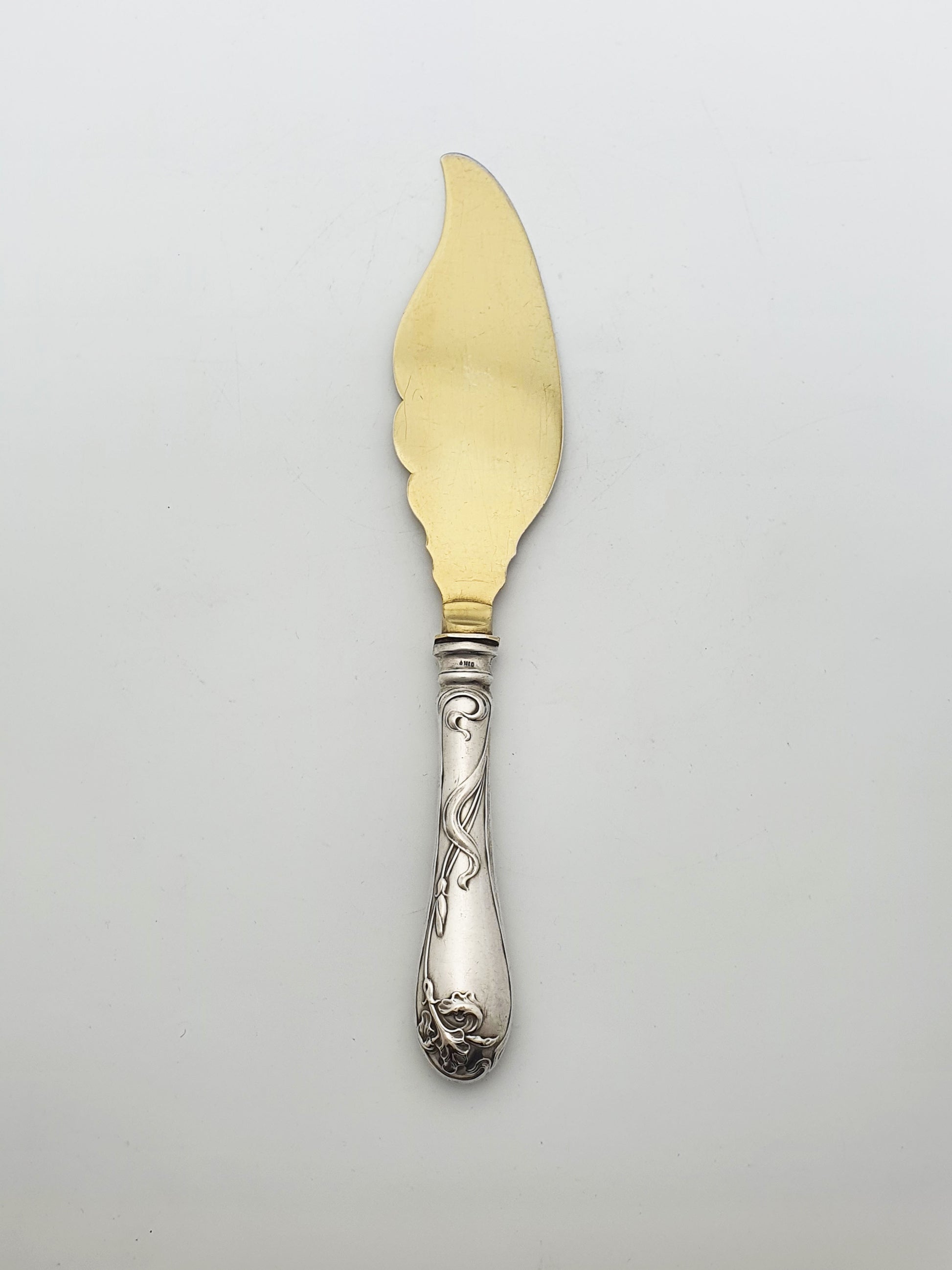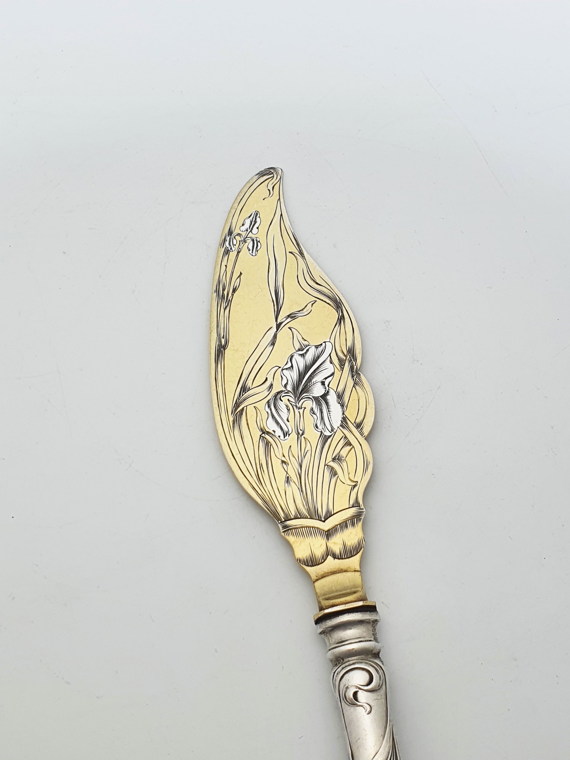 A Gorgeous Art Nouveau German Silver handled Pastry Server beautifully embodying the naturalistic flow and botanical motifs characteristic of the period. The silver-plate & gilt blade is intricately engraved with blooming irises, while the solid silver handle is adorned with elegant whiplash scrolls. The silver handle is marked ‘800’ silver – circa 1900.