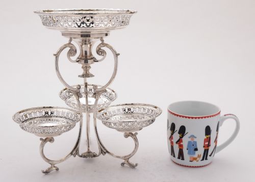 A gorgeous English Edwardian silver plated centrepiece comprising of stand and 4 detachable dishes which have pierced decoration. Circa 1905 Marked M & Co for the maker Robert Fead Mosley & Co Portland Works England FREE worldwide delivery. Measurements: Stand height: 10” (approx 25cm) Stand length: 9” (approx. 22.5cm) Stand width: 9” (approx. 22.5cm) Large dish diameter: 6 ¼” (approx. 15.5cm) Smaller dish diameter: 4” (approx. 10cm) Total weight: 729g In good condition - any dark areas are shadows from the photography there is no damage to the silver plate.