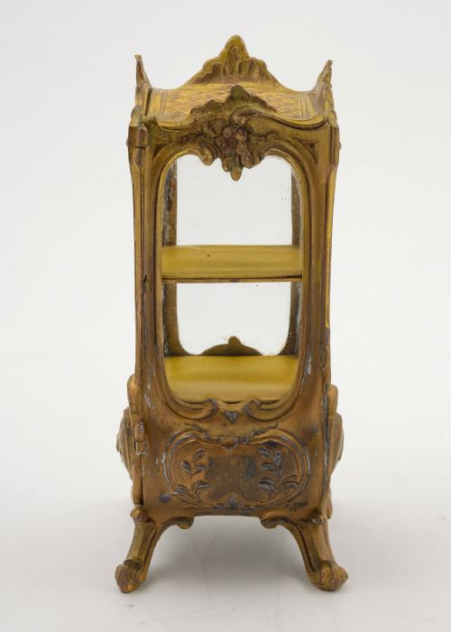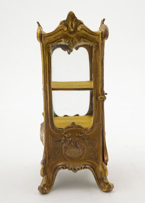A Gorgeous French Gilded Pewter Ring Cabinet in the style of a French display cabinet with side opening for access and glass panels to sides. circa 1900 Free Worldwide Delivery Measurements; Height 7 ( approx 17.5 cm ) Length 4 ( approx 10 cm ) Width 4 ( approx 10 cm ) Weight 1169 g In good condition - slight wear to gilding due to age.