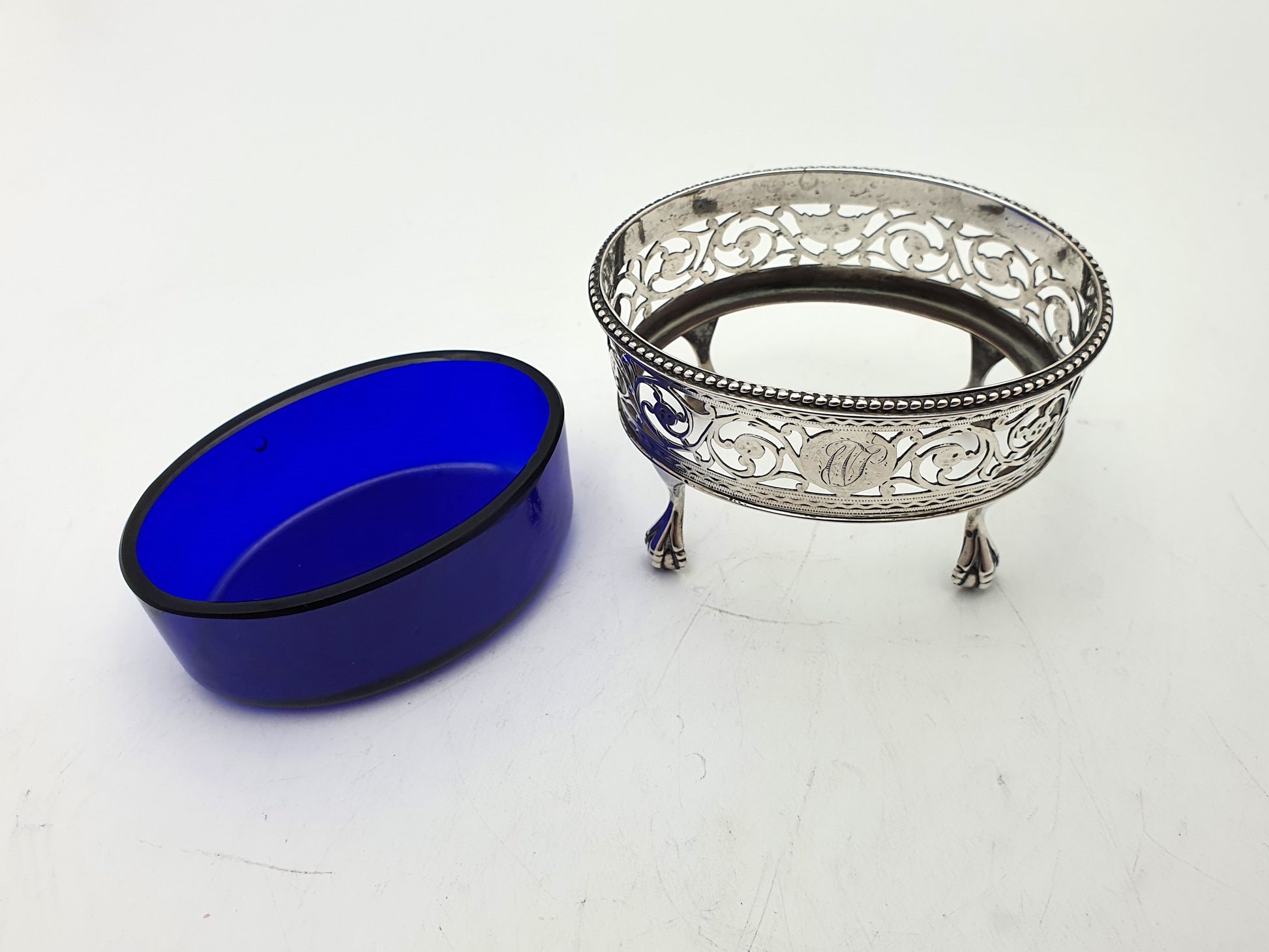 A Gorgeous Solid Silver George III Salt. The main body has delicately pierced decoration and stands four ball and claw feet. Marked ‘TD’ for Thomas Daniel and hallmarked for London, 1779.