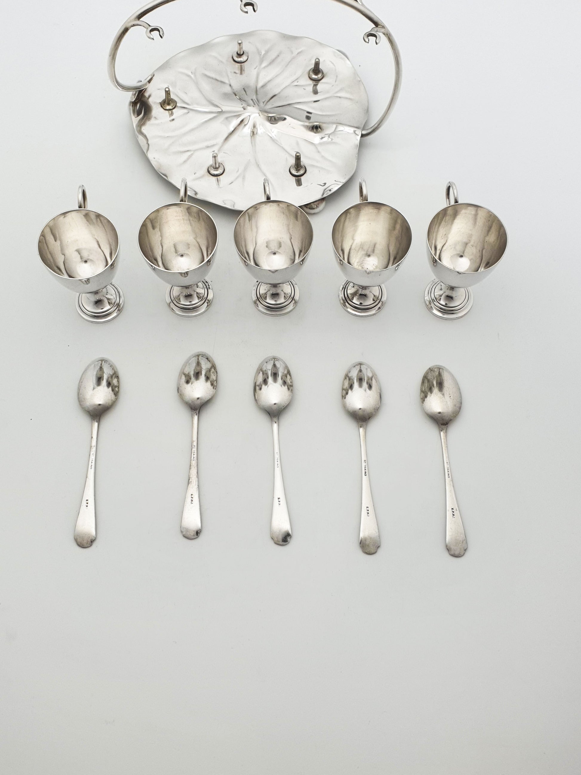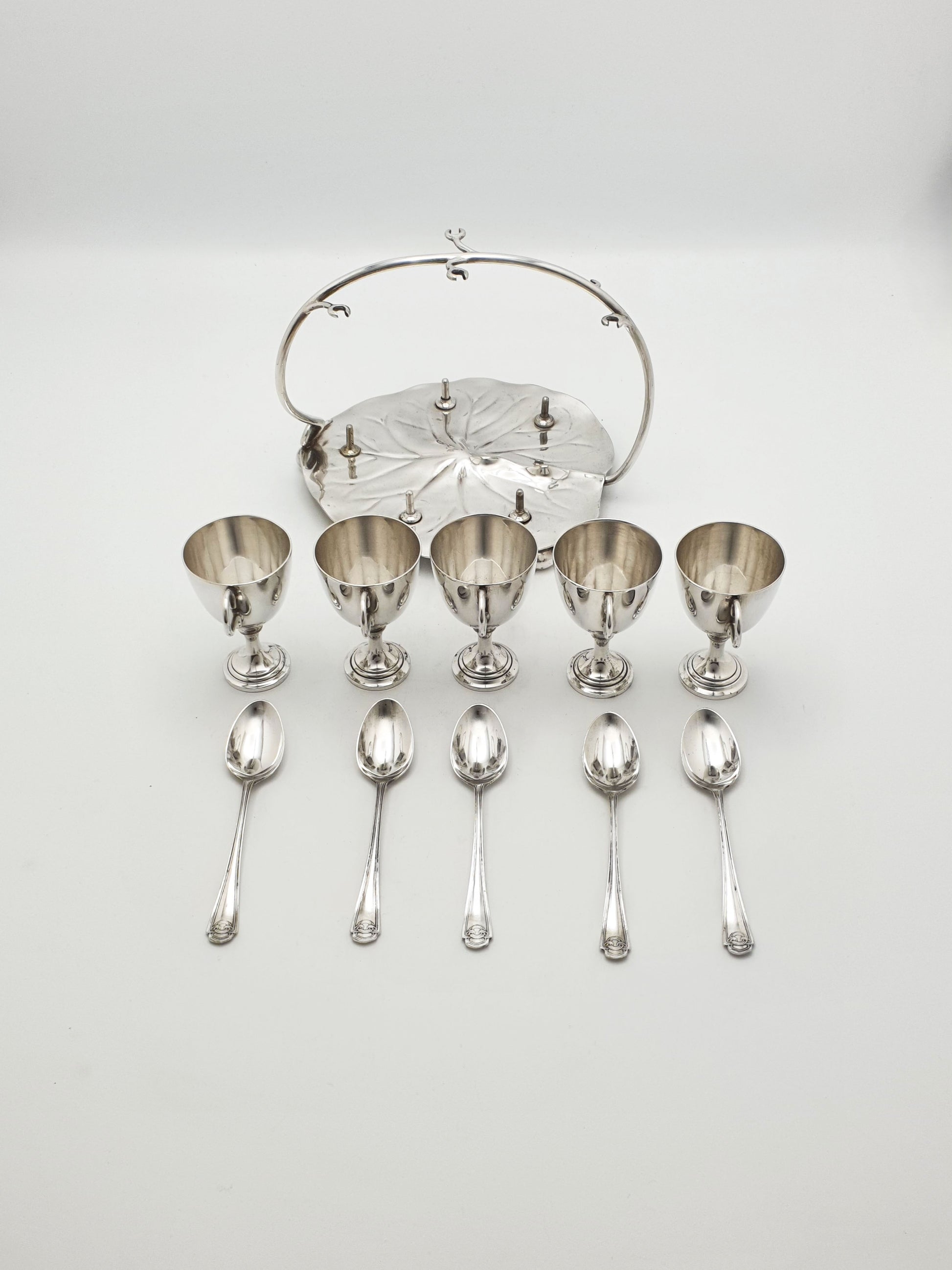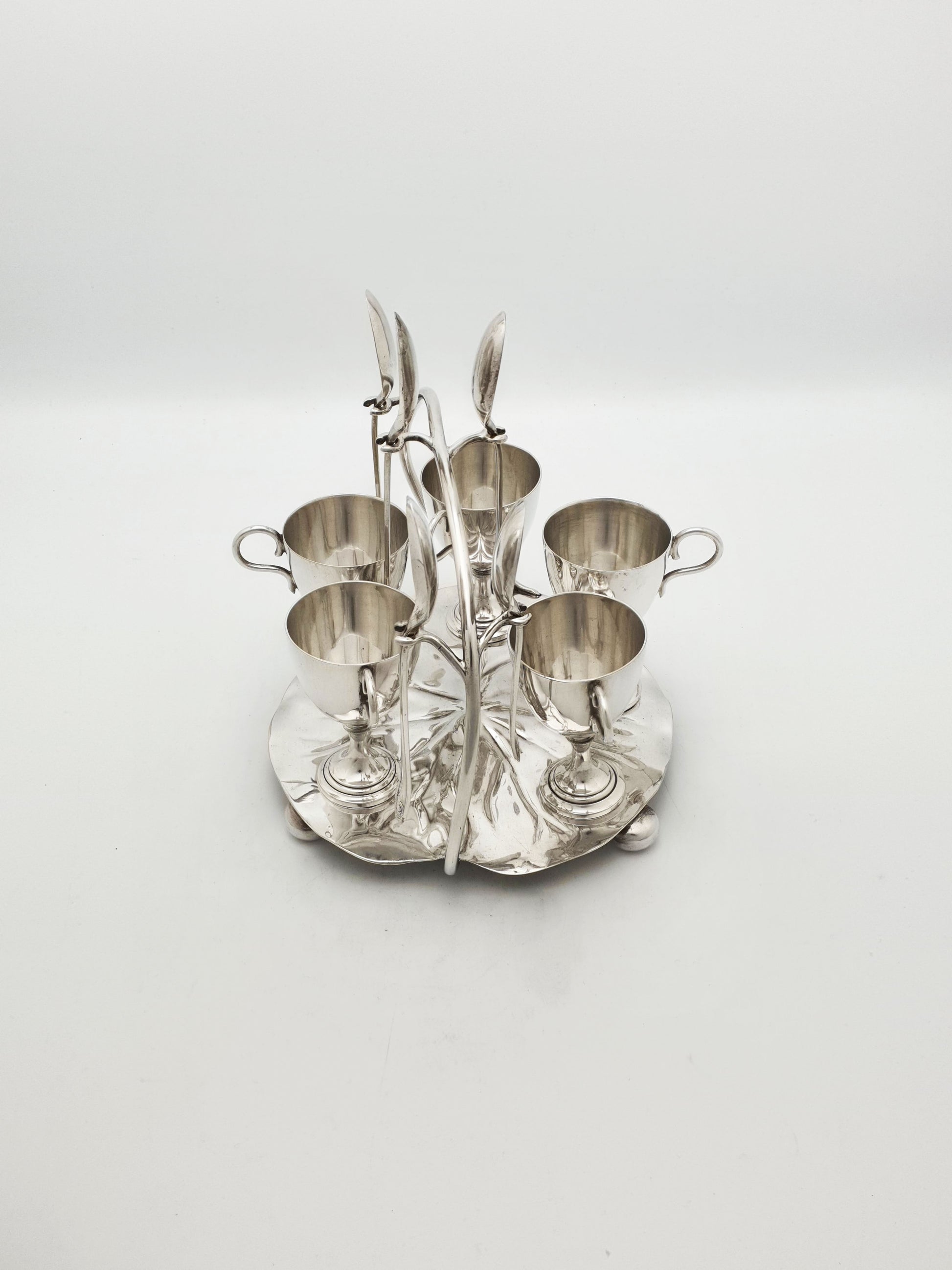 A Gorgeous Victorian Silver-Plated Egg Cruet. Crafted in the late 19th century, this whimsical set features five finely balanced egg cups with matching spoons, all arranged atop a beautifully formed lily pad-shaped base. With its arched handle that doubles as a spoon holder and display feature, this piece embodies the graceful artistry of the Victorian dining table – circa 1890.