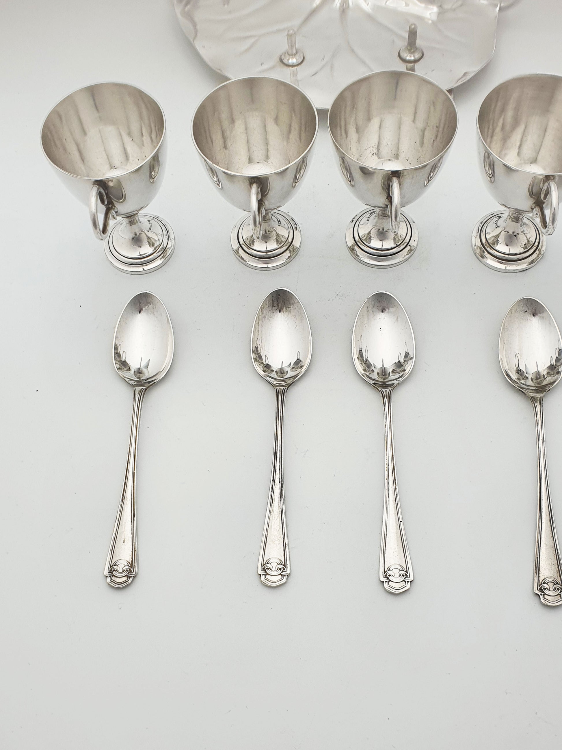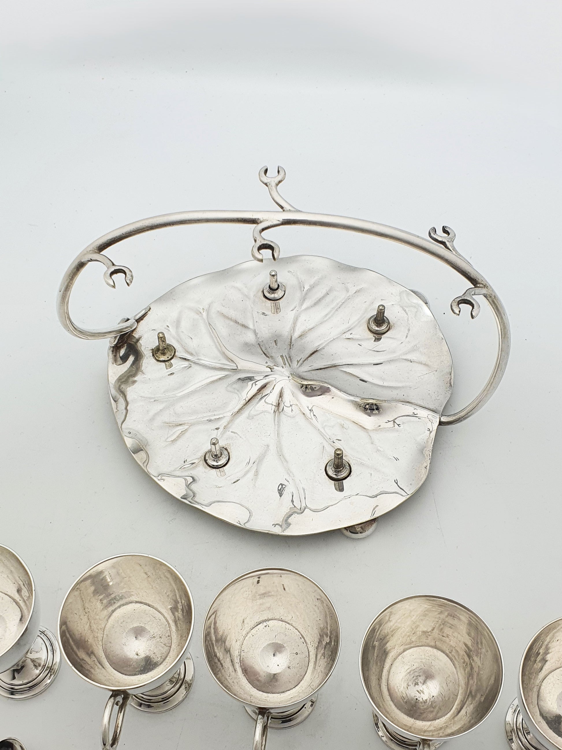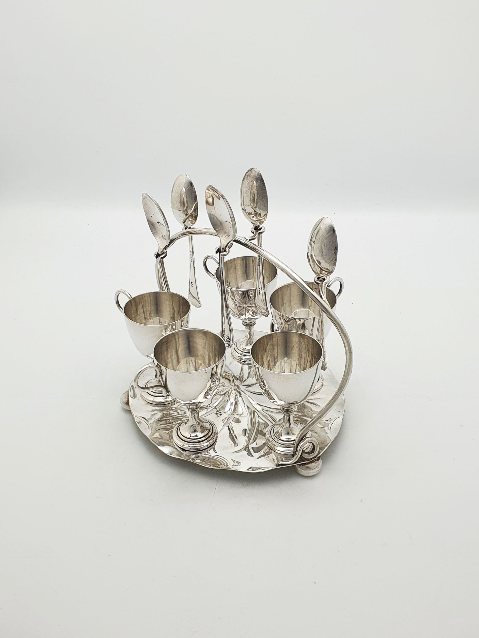 A Gorgeous Victorian Silver-Plated Egg Cruet. Crafted in the late 19th century, this whimsical set features five finely balanced egg cups with matching spoons, all arranged atop a beautifully formed lily pad-shaped base. With its arched handle that doubles as a spoon holder and display feature, this piece embodies the graceful artistry of the Victorian dining table – circa 1890.