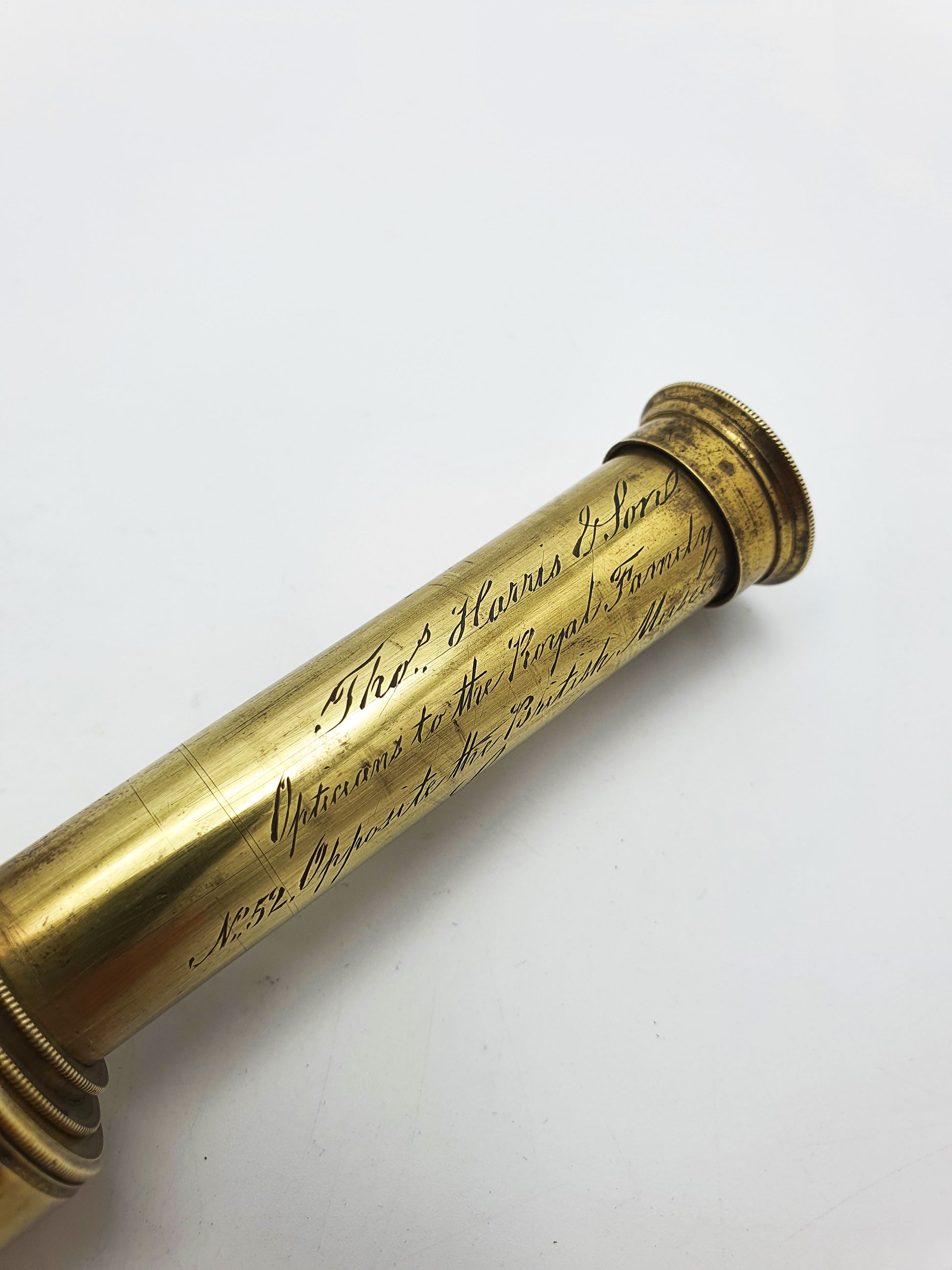 A Handsome Antique Brass & Mahogany Telescope made by Thomas Harris & Son, renowned opticians to the Royal Family and suppliers of precision instruments to scholars, explorers, and navigators of the era from 1808 to 1901. The barrel is finely inscribed: “Thos. Harris & Son, Opticians to the Royal Family, No. 52 Opposite the British Museum, London” - circa 1870.