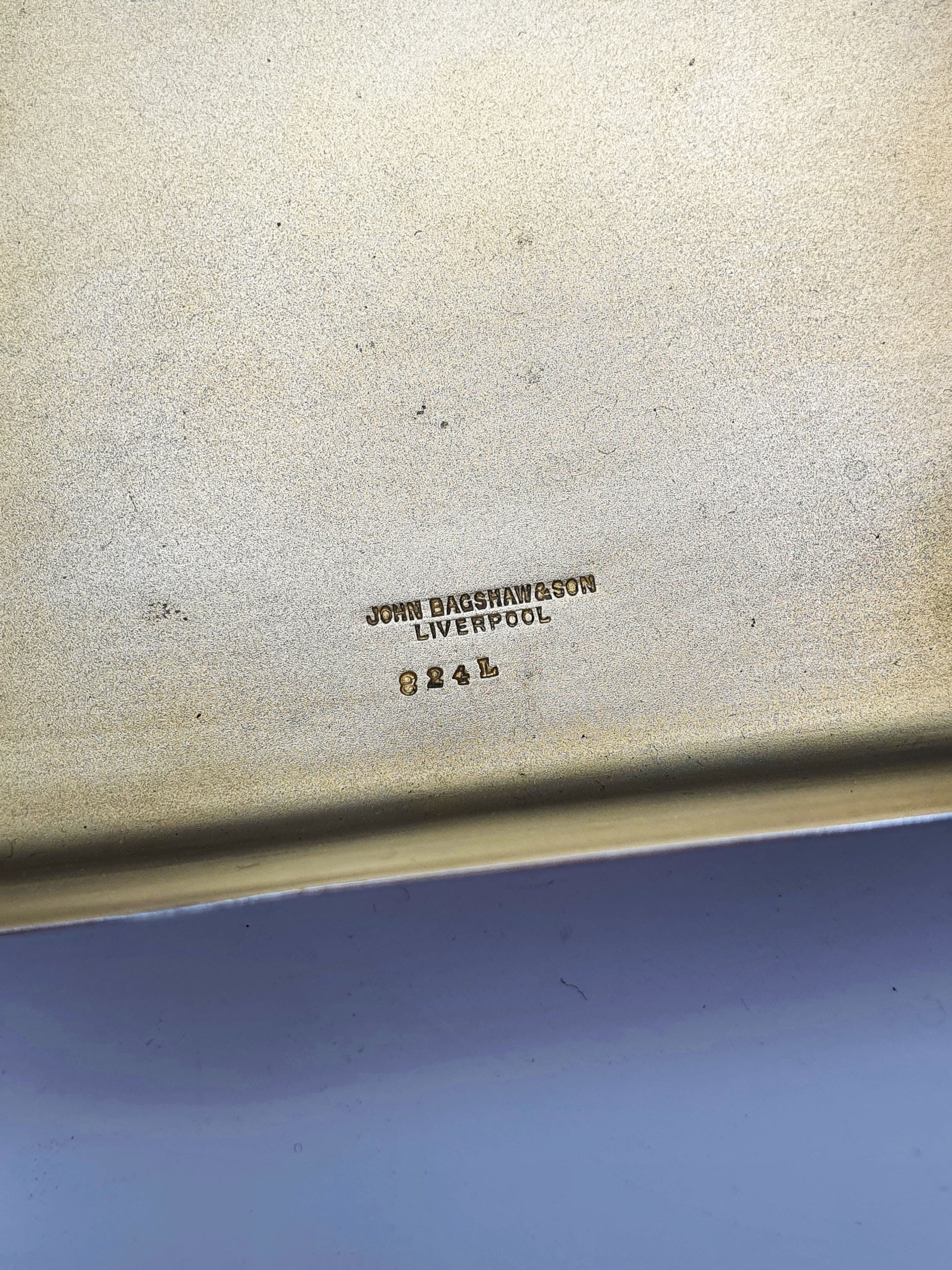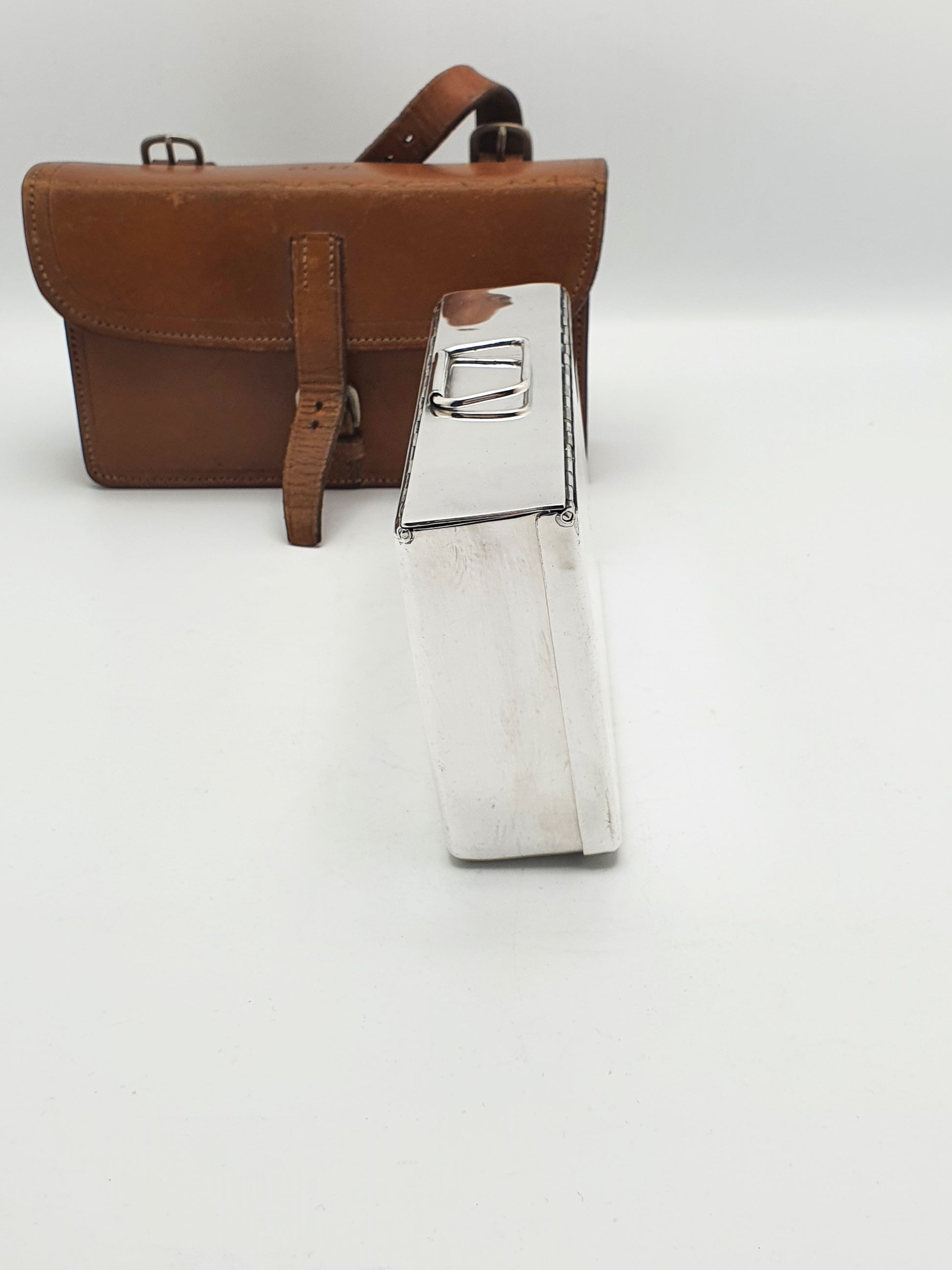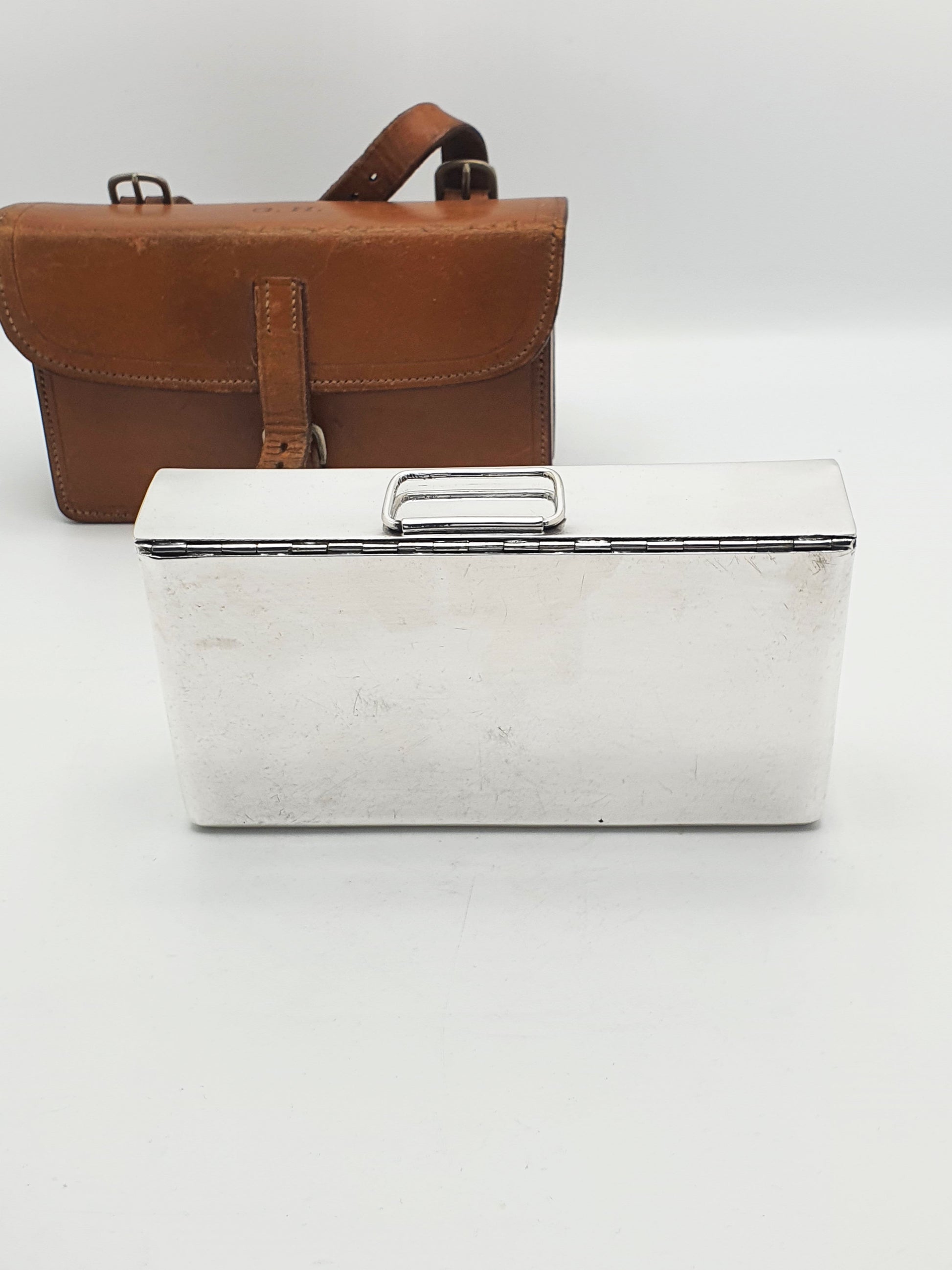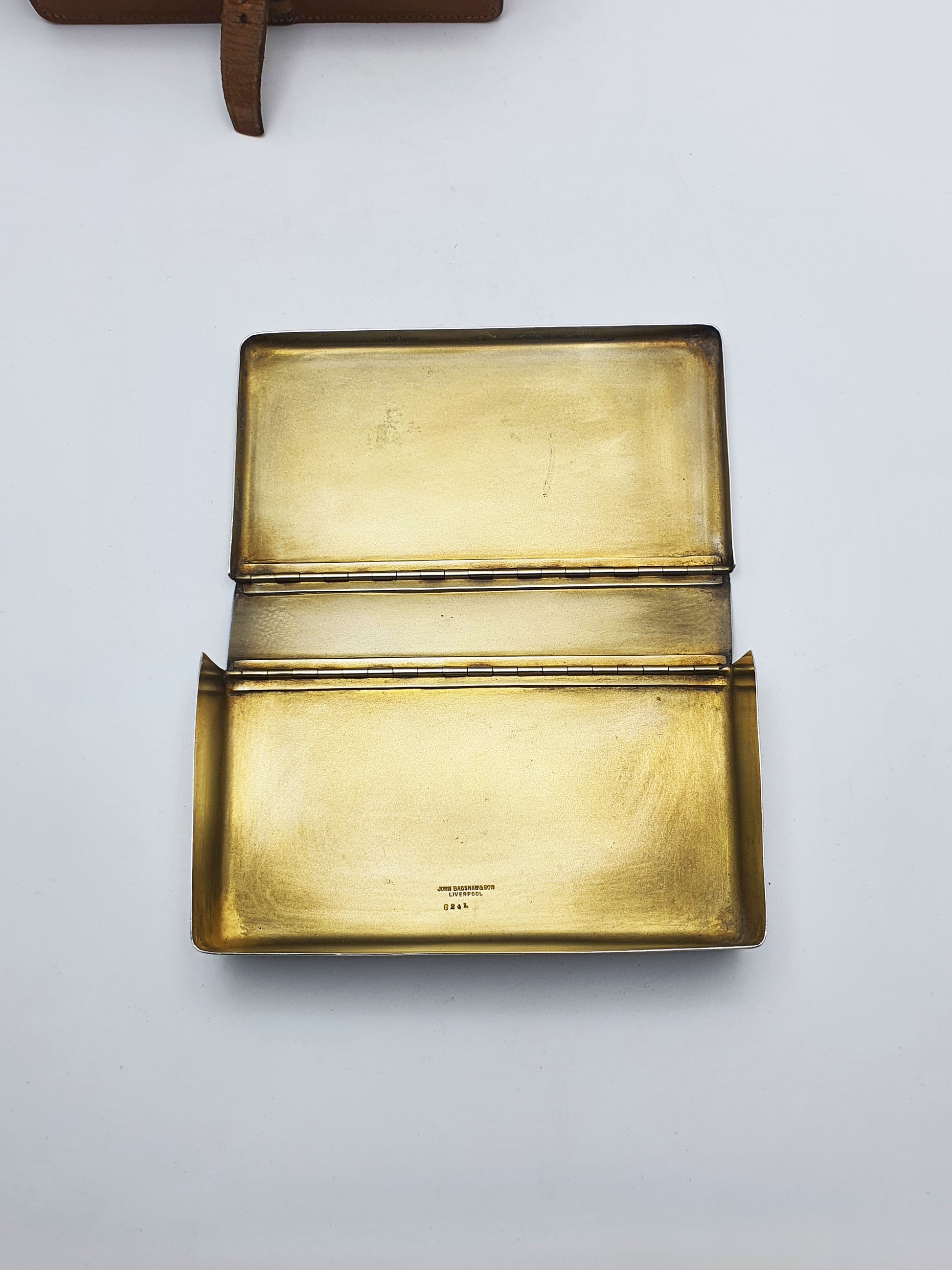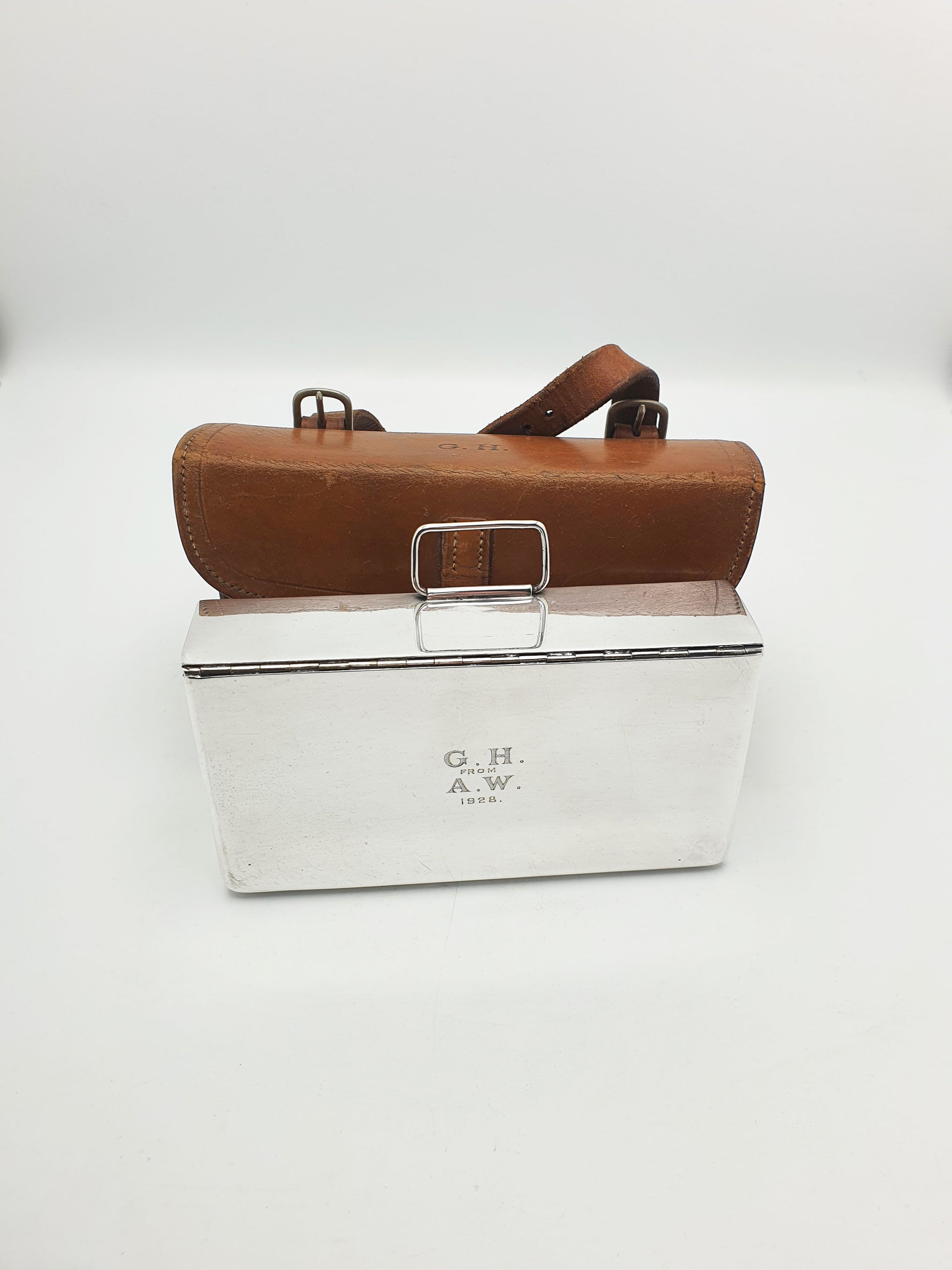 A Handsome Antique Leather Cased Sandwich Box of unusually large size. The silver-plated sandwich box has its original gold wash interior and is marked for maker John Bagshaw & Son, Liverpool. The case has a strap for ease of carrying and this box was probably for equestrian use - circa 1920.