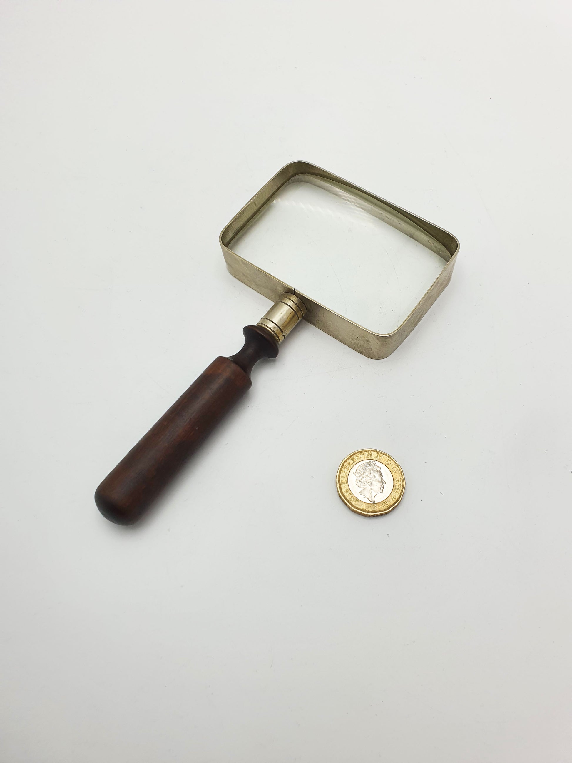 A Handsome Antique Rectangular Magnifying Glass with Wooden Handle featuring a sturdy metal frame and a beautifully turned wooden handle, it's the perfect companion for reading fine print, inspecting collectibles, or adding character to your desk or library – circa 1910