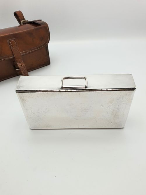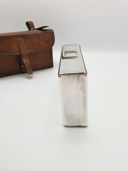 A Handsome Edwardian Leather Cased Sandwich Box of unusually large size. The silver-plated sandwich box has its original gold wash interior and is marked for maker Dickson & Sons England. The case has a strap for ease of carrying and this box was probably for equestrian use - circa 1905. Measurements: Height: 4 (approx. 10cm) Width: 7 1/4 (approx. 18.5cm) Depth: 2 (approx. 5cm) Total weight: 595g In good condition.