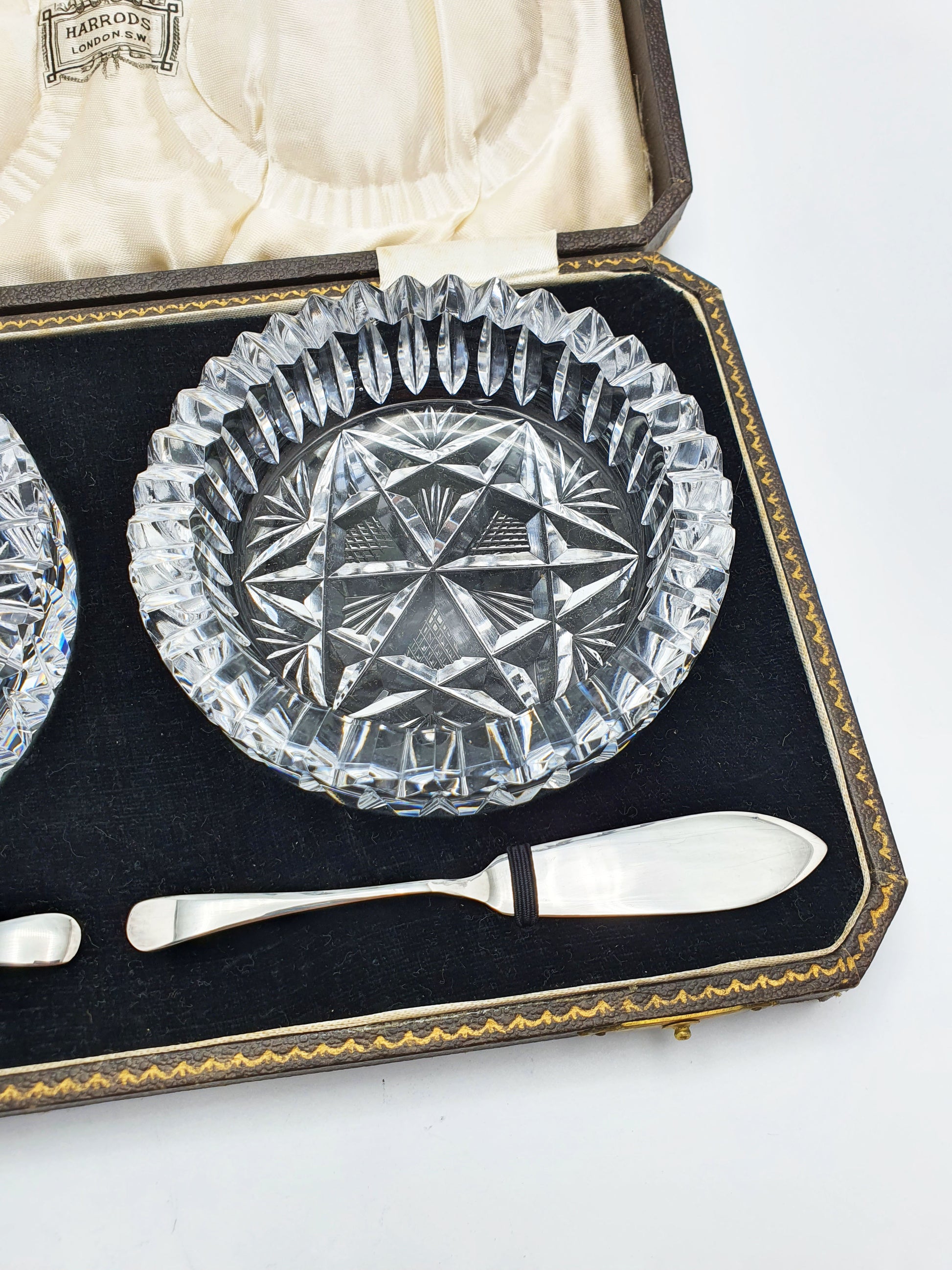 A Boxed Set of 2 Harrods Cut Glass Butter Dishes with Silver Spreaders. Each heavy cut glass dish boasts brilliant, geometric faceting that catches the light beautifully, and is paired with a sleek silver spreader - perfectly housed in their original silk-lined, velvet-fitted presentation case. The silver butter spreaders are hallmarked for Sheffield, 1933.