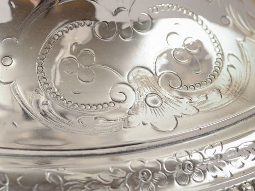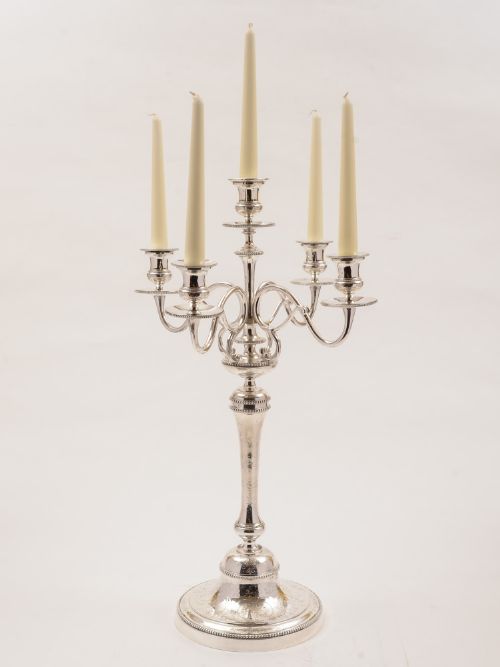 A fabulous French large silver plated candelabra made by Christofle. It has five branches and can be converted into a low candelabra if desired. Has beaded and engraved decoration. Circa 1900. Worldwide first class tracked and signed for delivery is included in the price. Measurements: Full height: 22 (approx 55.75cm) Low height: 14 (approx 35.5cm) Width (sconce to sconce): 13 1/2 (approx 14.25cm) Total weight: 3645g In good condition - any dark areas are shadows from the photography there is no damage to the silver plate. Note of condition: One of the sconces is a replacement and does not have the beaded decoration to the edge like the others have. This in our opinion does not detract from the overall look of the piece especially if the replacement is used as the centre sconce.