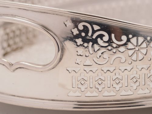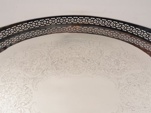 A stunning large English Edwardian silver plated gallery tray with pierced decoration to the gallery and beautifully embossed design to base. Stands on 4 bun feet circa 1905. Worldwide first class tracked and signed for delivery is included in the price. Measurements: Height: 3 (approx 7.5cm) Length: 20 (approx 50cm) Width: 13 1/2 (approx 34.25cm) Weight: 2130g In good condition - any dark areas are shadows from the photography there is no damage to the silver plate.
