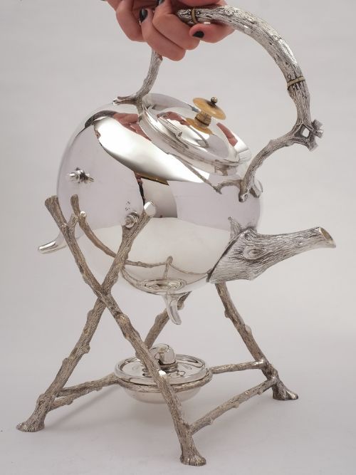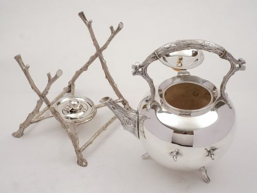A wonderful large English Victorian silver plated kettle on stand with tree-trunk design to handle. stand and spout and spirit burner to base. Circa 1880. Worldwide first class tracked and signed for delivery is included in the price. Measurements: Height (including stand): 14 (approx 35.5cm) Length (to spout): 9 (approx 23cm) Width: 8 (approx 20cm) In good condition - any dark areas are shadows from the photography there is no damage to silver plate.