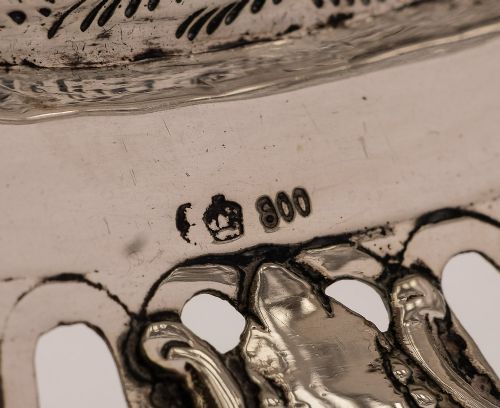 A Lovely 800 Silver German Basket with pierced and embossed decoration and cherub decoration to centre of the bowl - circa 1900 FREE UK Delivery - rest of world delivery charge £20.00 Measurements Height 2 ( Approx. 5 cm ) Length 8 1/4 ( approx. 21 cm ) Width 6 ( approx. 15 cm ) Silver weight 145 g 4.66 Troy 0zs. In good condition - no splits or damage to the silver