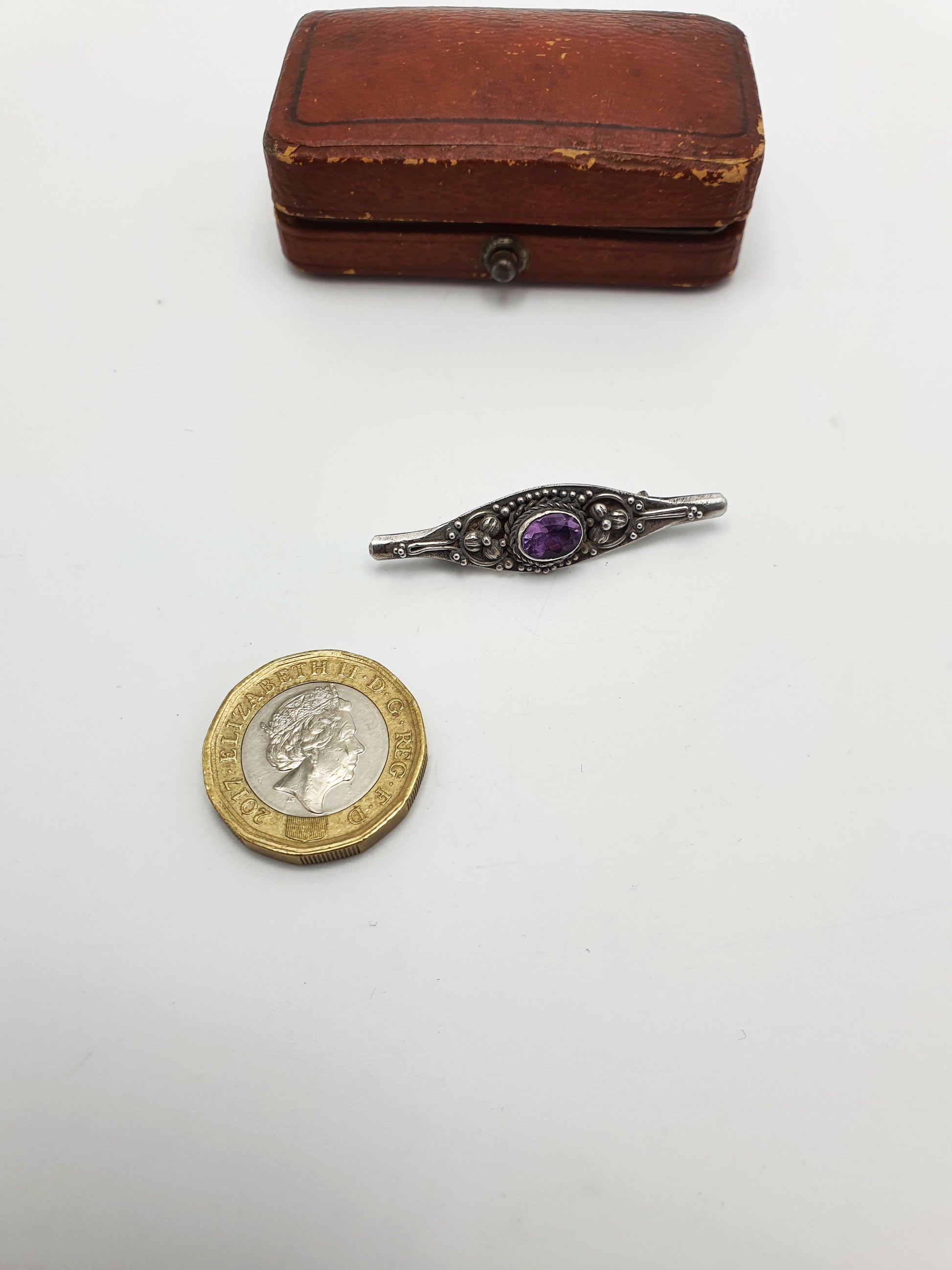 A Lovely Antique Edwardian Silver and Amethyst Bar Brooch featuring a central faceted purple amethyst framed by finely detailed silver beading and linework, lending depth and texture to the slim bar form. Marked .925 for sterling silver. This brooch comes in a velvet and silk lined box – circa 1905